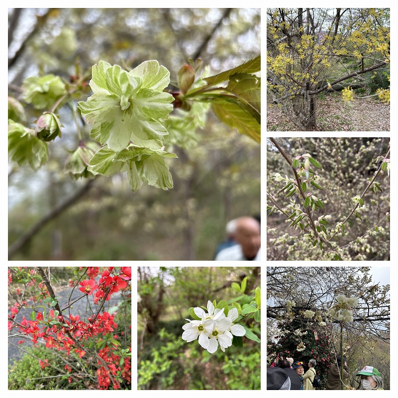 | だんだん普段着で歩いている人が増えてきて、花見山山頂展望台(推定180m)到着。ここはまさに桃源郷、百花繚乱。 | ||||||||||