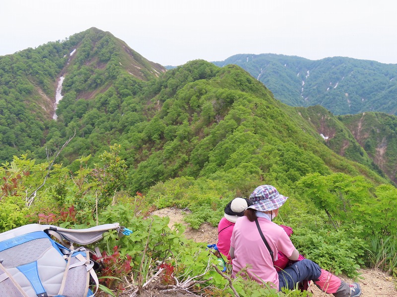 | ニセピークに何度かだまされるもついにハイタッチで山頂へ。新潟の山、その先の日本海と粟島、なじみの朝日、飯豊を見渡す | ||||||||||