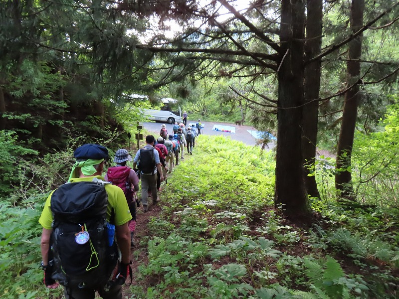 | 登山口までの道が通行できるか不確かなためやむなく登山口手前の道路に駐車、準備完了。大滝会長と新会員さんより挨拶。 | ||||||||||