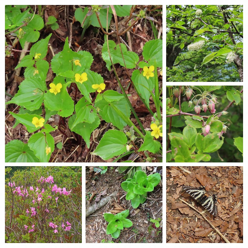 出会った花② : オオバキスミレ 右 ウワミズザクラ(上溝桜)、ウラジロヨウラク、下 ムラサキヤシオ、