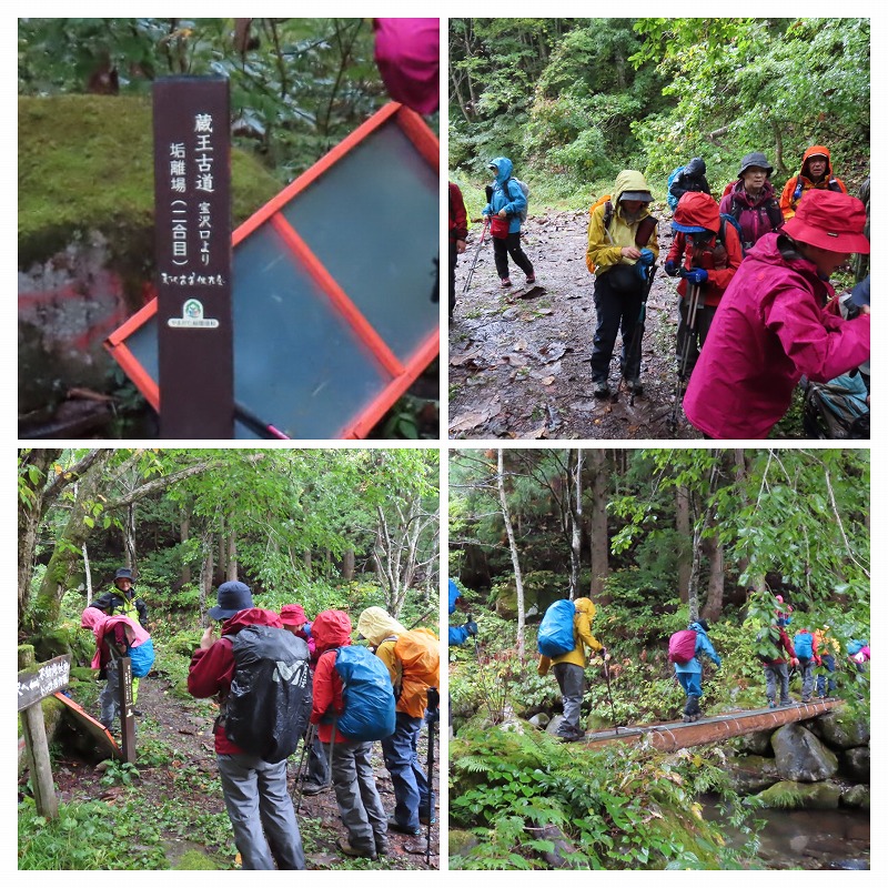 | 古道入り口の大きな石の蔵王権現に一礼してスタート。雨でぬかるんでいて歩きにくいが一合目行別地蔵、 | |||||||||