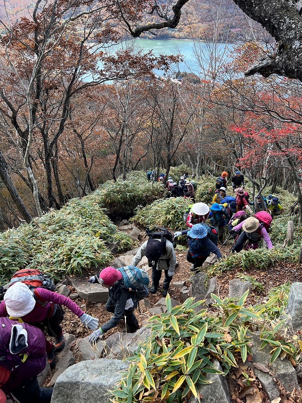 | 確認、声かけて先に通しながら、ほぼ直登の岩ゴロゴロの登山道を登っていく。時々下の大沼や周辺の山が見える。 | ||||||||||