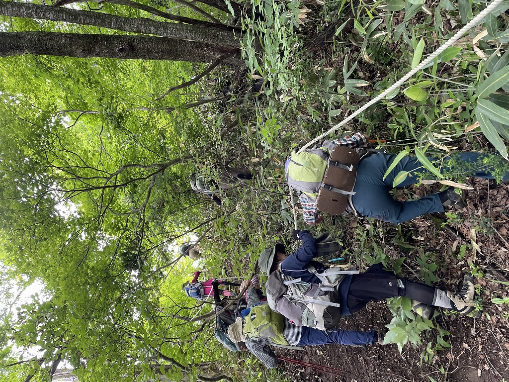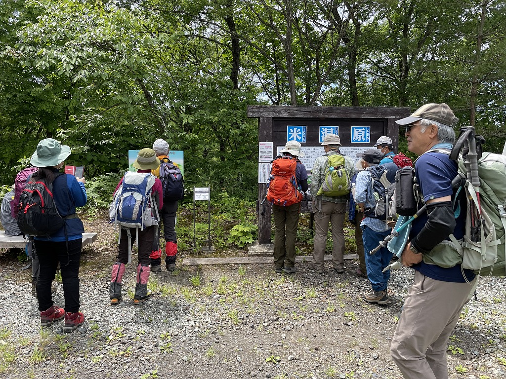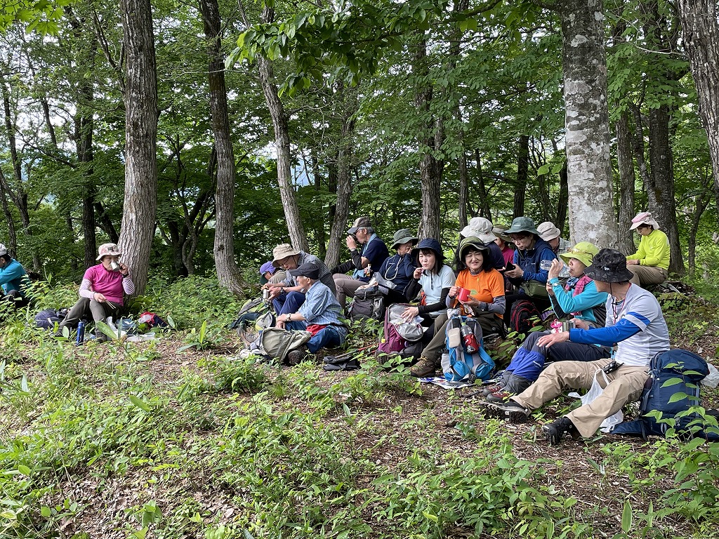 湿原のトップで休憩 屈伸運動かお疲れ様か