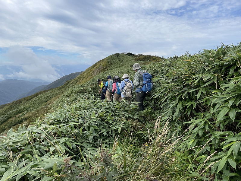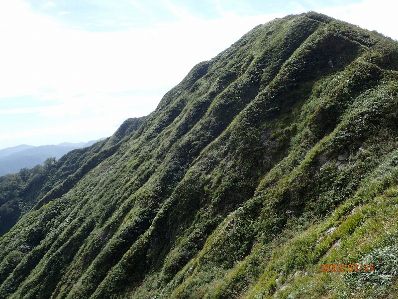 | 切れ落ちた細尾根が続く。刈払されて足元は見えるが、それでもヒヤリハットの場面が。 | |||||||||