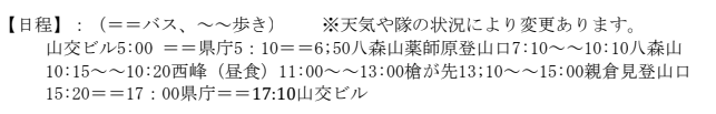 | 5:00県庁 6:50薬師原登山口着 6:55スタート 9:50八森山西峰着(昼) | |||||||