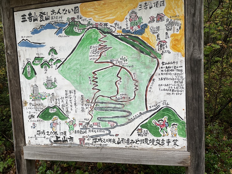 | 下りは、雨と落ち葉で滑りやすく、ロープをしっかり掴んで慎重に。30分ほど歩いて三吉山に到着。 | ||||||||||