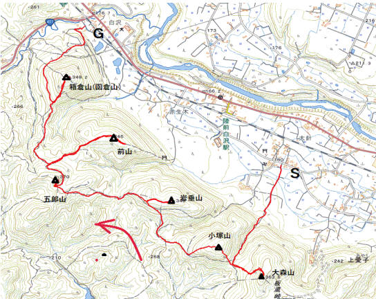 白沢五山にゴロ山を加えて標高350m前後の六山、合算で2,122mを登った。 |