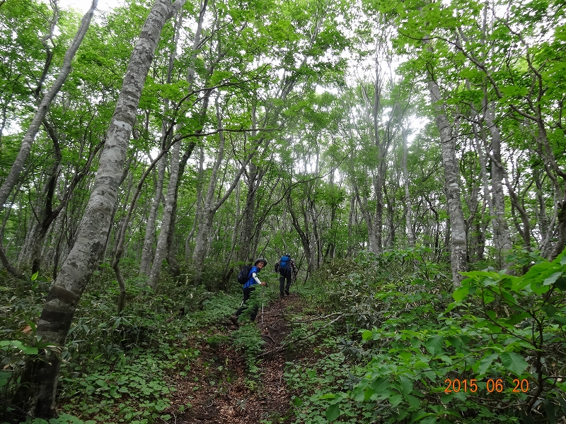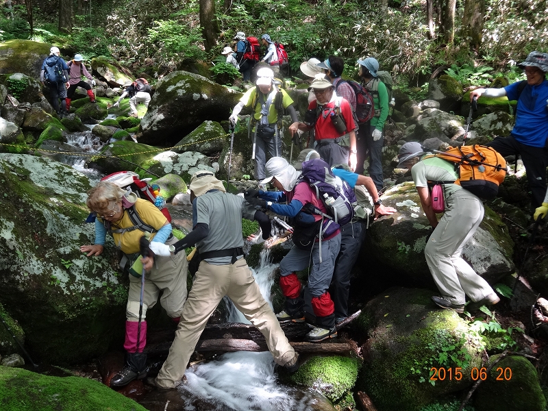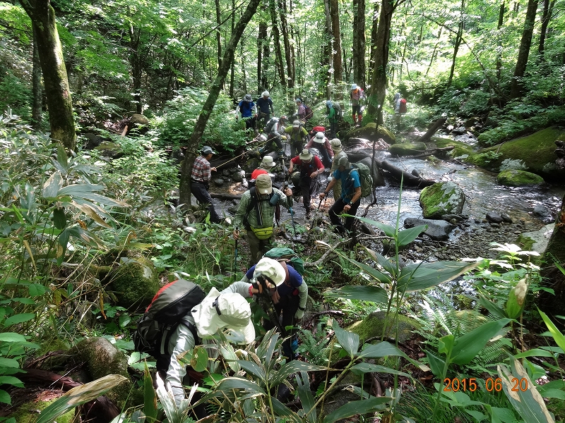 ブドウ沢の駐車場でリーダーより熱中症・雷・増水時の渡渉についての注意点などを聞き、登山開始。木漏れ日のブナ林を進み第一渡渉地に至る。こちらの山域は前日・前々日と雨だったということで、水かさが増しているように思われる。苔むした石・岩は滑りやすく、慎重に互いに助け合いながらの渡渉となる。何とか第一関門クリア。