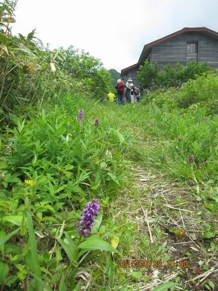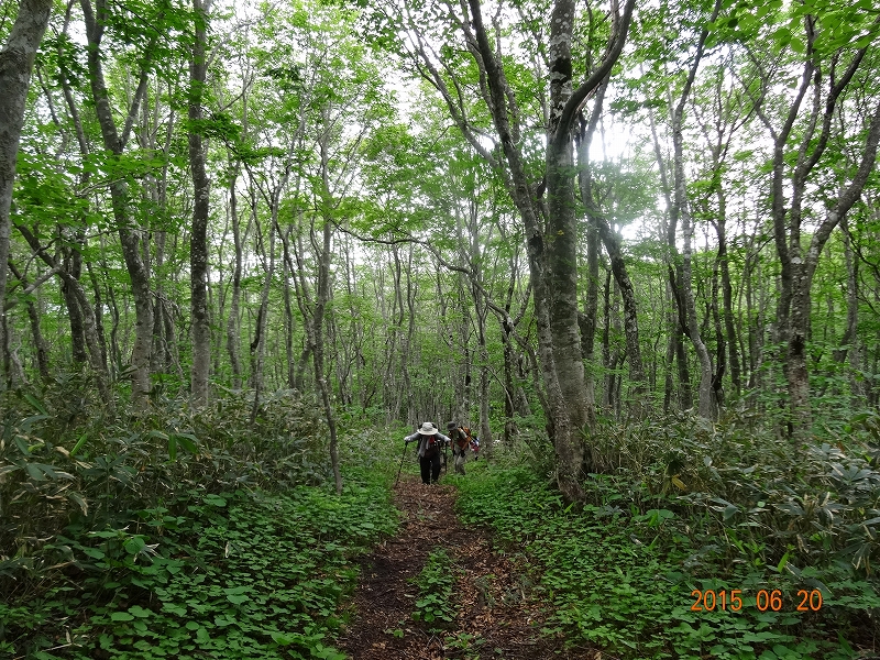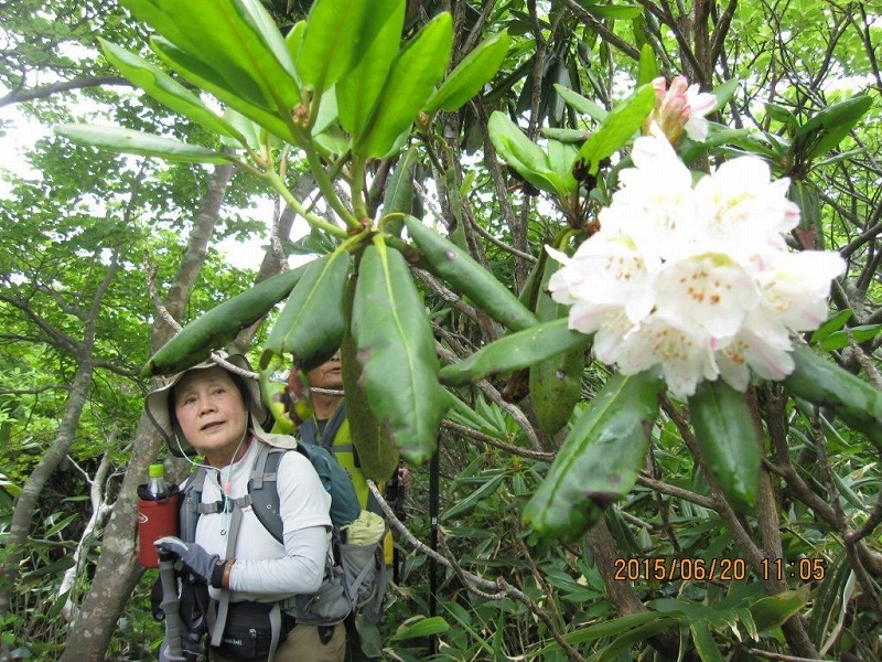 第二渡渉地はさらに水量が多く激しく水しぶきをあげており危険が伴う。ベテランの会員が安全なルートを確保してくれて、全員無事に渡り終えることができた。助け合いに感謝。緊張から解放された耳に林間に響く小鳥(ミソサザイか?)の美しい歌声が飛び込んできた。ホトトギスの声も聞こえる。ここまではあまり標高をかせいではいないが、この後見通しのきかない樹林帯の急登が続き、たっぷり汗を絞られる。疲れをいやしてくれる可憐な花々もすでに時期を過ぎており、わずかにオヤリハグマ・カニコウモリなどの地味な花が咲いている。急登を過ぎるとブナ林の広い尾根に至る。展望はきかないが、足元にギンラン・コバイケイソウなどの花が見られるようになる。あまり人が入っていないのか、やぶが覆いかぶさっているところや、前日までの雨のためか、歩きにくい泥んこの悪路もある。八方平避難小屋が近づくにつれ、サラサドウダン・ウラジロヨウラク・ハクサンシャクナゲなどが目に飛び込んでくる。小屋のあたりはハクサンチドリの群落、珍しい色のウツギも今を盛りと咲いている。花博士のSさん、「ニシキウツギかも!」(紅花二色ウツギ?)。雲行きが怪しくなってきたので、南雁戸山へと急ぐ。タカネバラ・ミヤマウスユキソウ・ミヤマハンショウヅルなどを横目に先を急ぐ。ガレ場に出ると展望が開け、今来た道などが見渡せるが、あいにく曇り空になってきて蔵王など山頂部分は見られない。南雁戸に到着。眼下には蔵王ダムを望むことができる。雨の心配等があったので、狭い山頂で早めの昼食を済ませて北雁戸山へ向かう。一気に下ってまた登り返す。急下降のため先を行く人がはるかかなたに小さく見えるような感じで、慎重に歩を進めるがなかなか間が縮まらない。一時のことがやたらと長く感じられる。小雨がぱらついてきた。急登を登り詰め北雁戸山頂に至る。曇天であまり展望がきかない。記念写真を撮って早々に下山開始。またまた緊張を強いられる急下降。なじみの蟻の戸渡りがなんだか違う印象がある。全員無事難所通過。