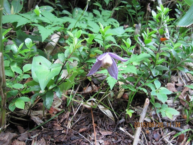 滑川分岐からは新山方面へ。炭焼き小屋跡の多く残る古くからの道だそうだが、あまり人が入っていないルートのようでやぶ漕ぎに近い状態になる。途中数人が地蜂に刺されるハプニングあり。ミズが群生していて、「おいしそう!」との声が上がるが、今日は山菜取りはなし。花期を終え、実を付けたサンカヨウの群落もあり、花の時期はさぞやと思われる。林道に出るとカーブミラーがあり、かつては車が通れたのであろうと思われるが、今は全く通れそうにない。林道をひたすら下って予定よりも早く駐車スペースに無事到着。