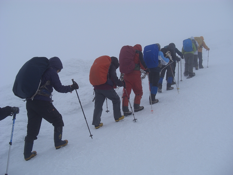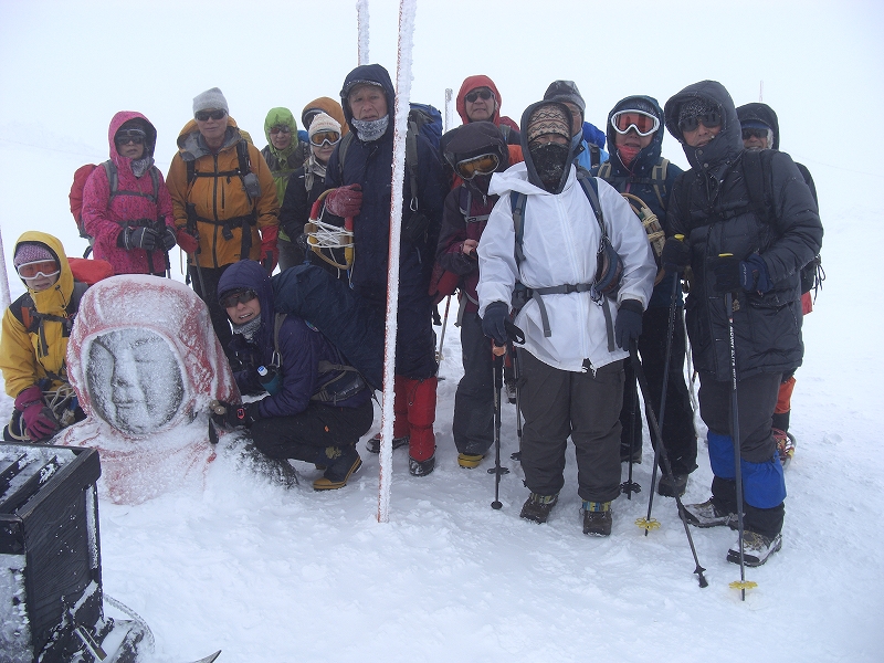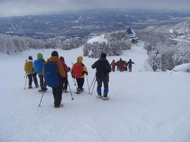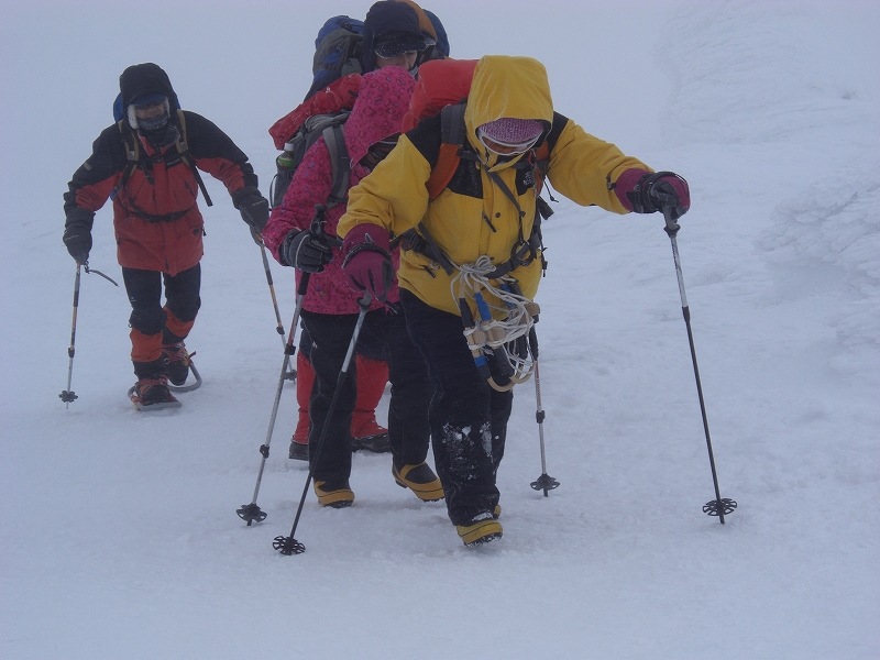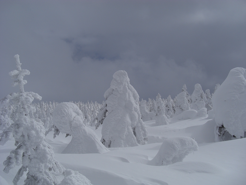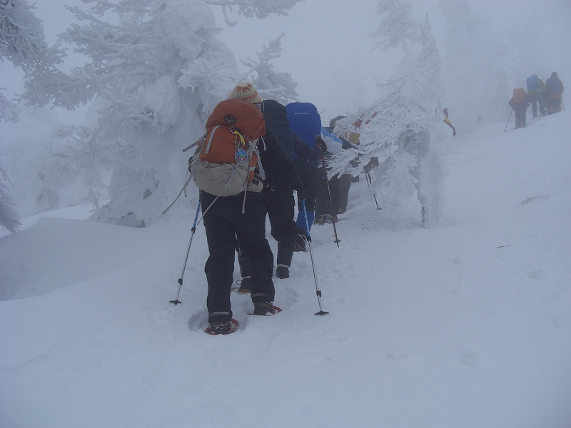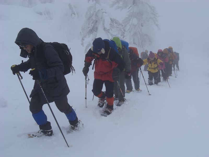 余り良い天気予報ではありませんでしたが ロープウエイの乗り場には樹氷鑑賞の人や我々の様なトレッキングの人が沢山並んでいる。スキー客は混むのでリフトを繋いで山頂に行くのだそうです。高原駅からユートピアゲレンデの端の方を1列で登って行く。樹氷原コースに入り パラダイスゲレンデに入る少し手前から(樹氷原コース76番)樹氷の中に入ってゆく 少し風はあるが素晴らしい景色です。ラッセルの経験を全員でして頂こうと 先頭を順に交代する 良い経験ができました。山頂駅で休憩をしてから 地蔵岳に向かう 山頂は風が強く写真を撮り直ぐ下山する。又山頂駅に戻り昼食を食べて 下山はザンゲ坂を下る。途中晴れて来たので 写真や景色をゆっくり堪能して高原駅に戻りロープウエイに乗り無事山麓駅に着く お天気が心配でしたが 満足な1日でした。 |