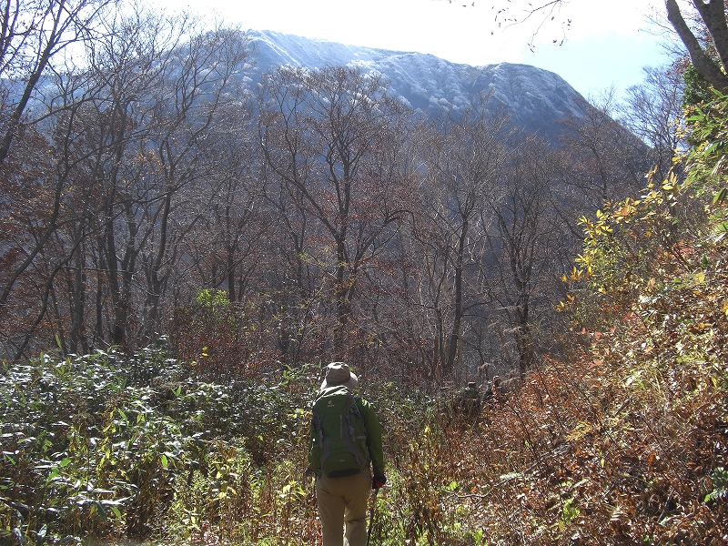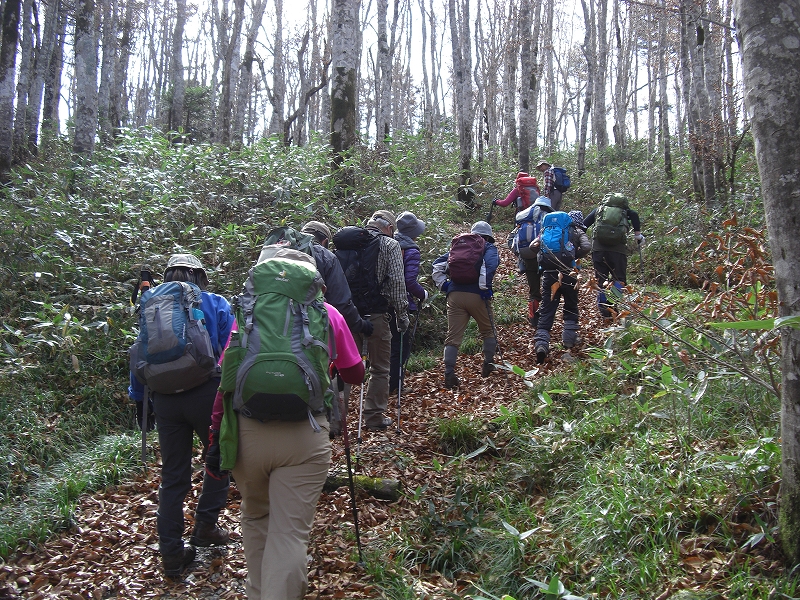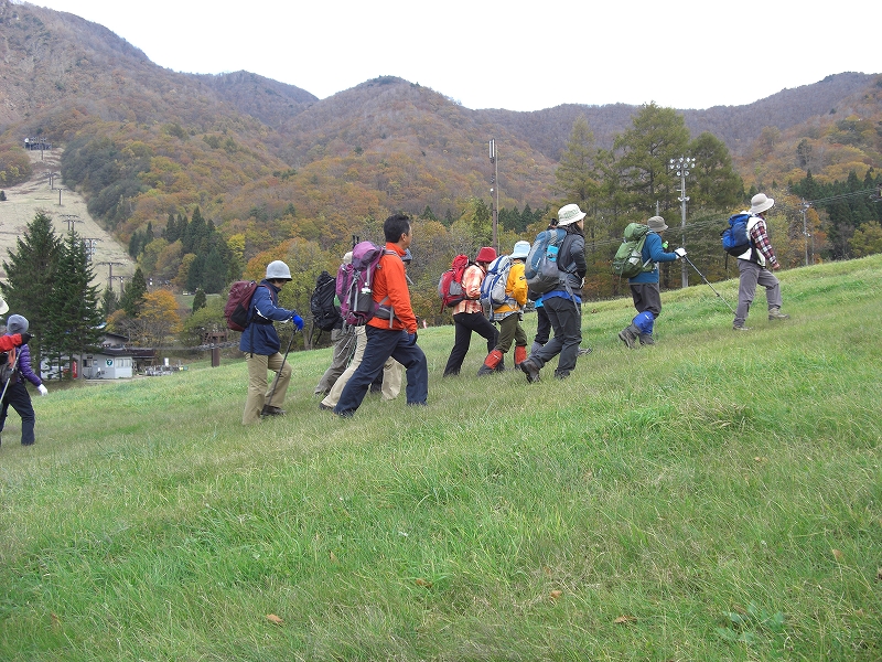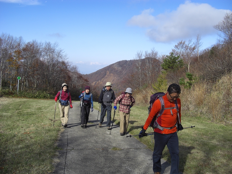 今回の山行は、古の登山道を通り、五郎岳を北側から巻いて、東側のヨシ沼に行き、西側より、雁戸山を見ることである。蔵王温泉バスターミナルをスタートし、上の台ゲレンデを通り、温泉第三線リフト降り場から七曲り登山コースに入る。今日は、冬型の天気予報で、雪を覚悟してきた人も多かったのではないかと思います。しかし、晴天に恵まれ、温泉街、上の台周辺は紅葉が真っ盛りで、落ち葉を踏みながらの登山は、爽やかな気持ちになる。