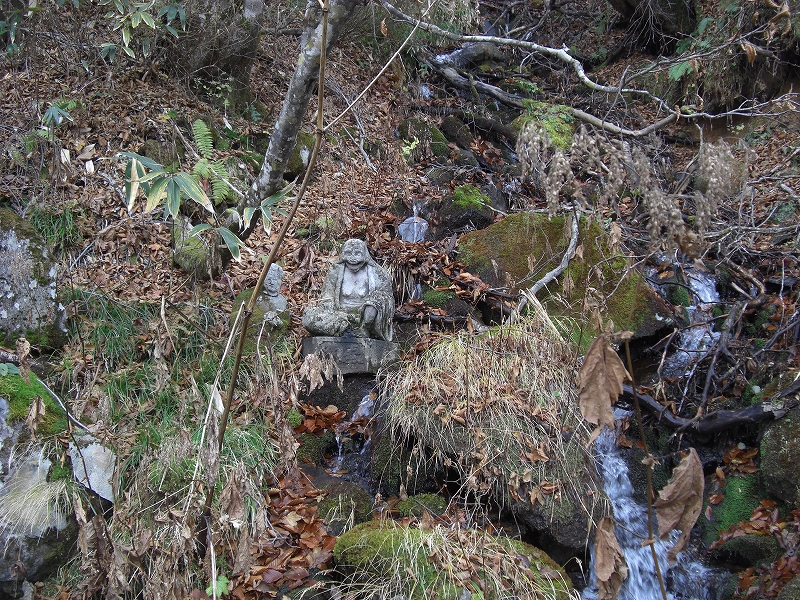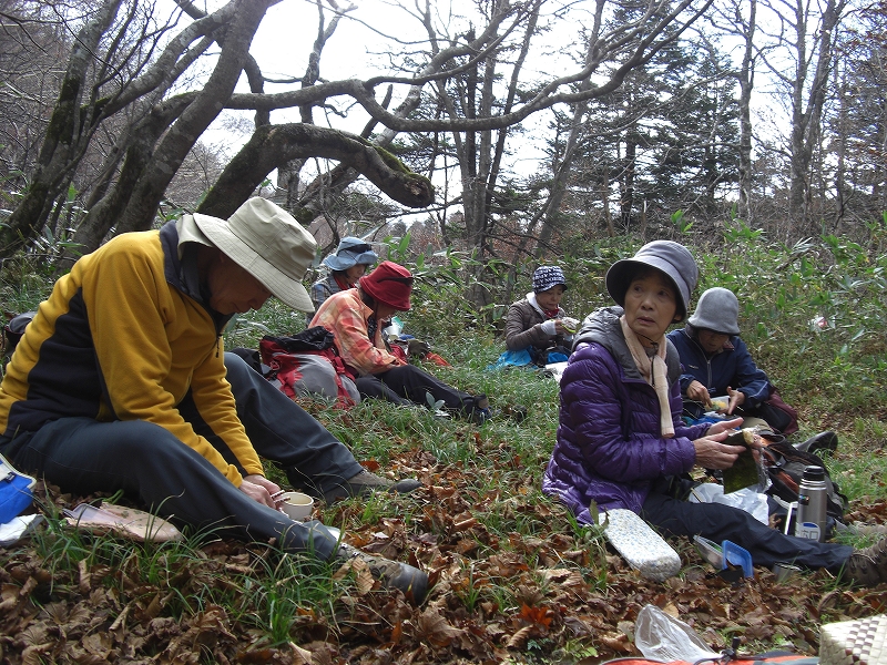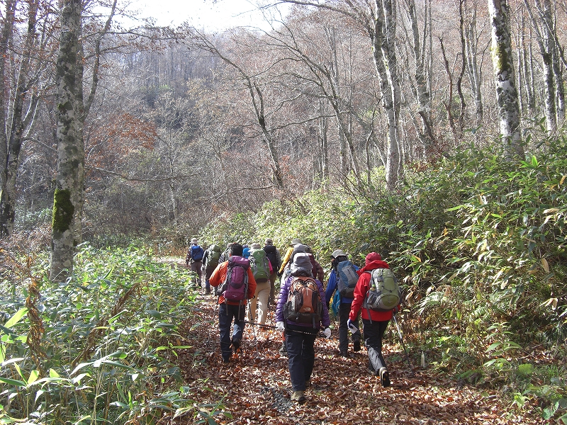 コタン散策路分岐で昼食、片貝沼からここまでのコースは、紅葉の名所であるが、ヤマモミジの葉も全部落ちていました。時間も少し遅くなっていたので、イロハ沼、観松平コースからキャラボク原生林コースに変更、樹齢何百年のキャラボク群は、本当に見事で感動しました。下りの祓川コースはなだらかなコースと思っていましたが、落ち葉に隠れた、ゴロ石に何回かつまずき、上り下りも多いコースだと気づきました。しかし、紅葉のフィナーレを彩る、谷間に残ったモミジやブナ、コシアブラ、ドウダンなどが鮮やかで、今日の厳しい山行を癒してくれました。 |