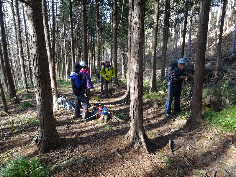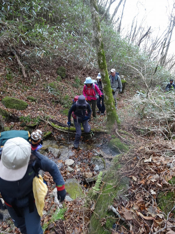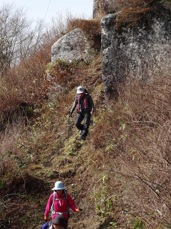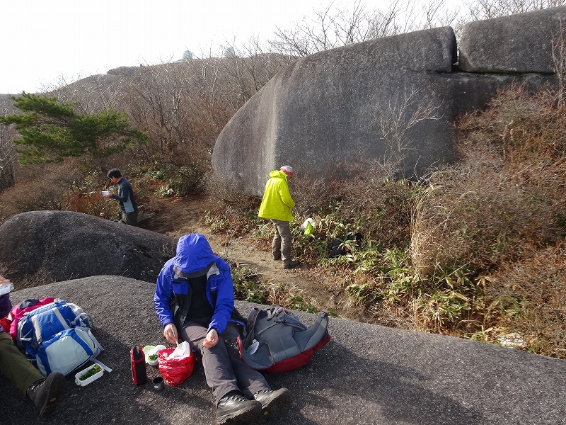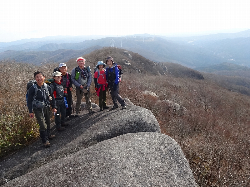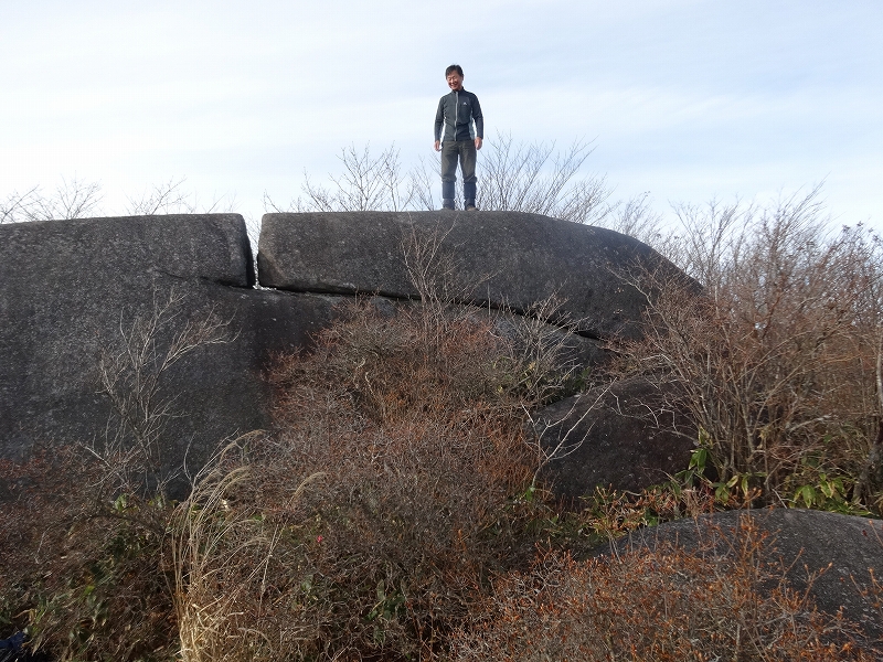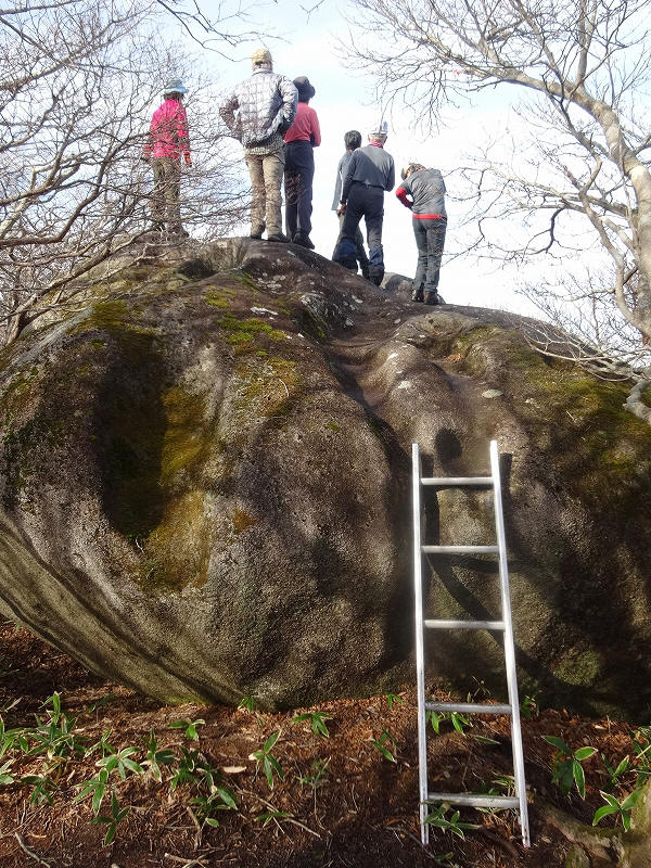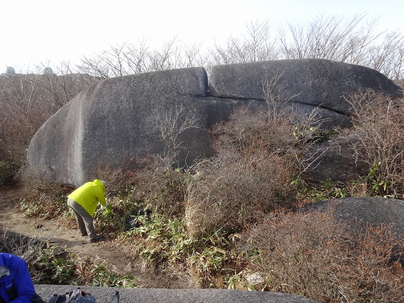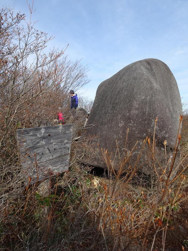 大滝根山は、日本三百名山の一つであり、花の百名山でもある。又、阿武隈山地最高峰の山である。しかし残念ながら、放射能汚染の懸念で、参加者は7名だけ。その為、自家用車2台での山行となった。 出発前に、会長より挨拶。今回は山頂までの時間が余り掛からないので、「ぺらぺら石」や「石ぽつけ」にも足を延ばしたいとの事であった。 12月ではあるが、天候は晴れ。御沢に沿って、穏やかな道をたどる。10分も歩かない内に、脱ぎタイムを取る。渡渉を繰り返し、少し行くと賽ノ河原。そして、沢の源流近くには、冬支度をした御沢子育地蔵尊が迎えてくれる。ここから、山頂近くまで急登が始まる。周囲にはシロヤシオなどのツツジが群生している。航空自衛隊のレーダー基地の機械の騒音が聞こえてくると、大嶽根峯霊神社が祀られている大滝根山山頂へと到着する。神社の奥の自衛隊のフェンス越しに、三角点を確認する。山頂の案内板に、梵天岩の矢印があったので行って見る。ハシゴを使い、変なクボミのある岩に登ったらびっくり!北西方面の眺望が素晴らしい!左側から、磐梯山、その上方に真っ白い飯豊、山頂がチョット白い吾妻、真っ白い朝日と月山、雪のない蔵王、そして、その上には白い鳥海山が見えるではないか‼ なんと山形にある百名山の6座が一望に見える。その後、奇岩を探しに、雑木林を下って行く。玉石から、石ぽっけを見る。奇岩が群生していて、すばらしい! 分岐まで戻り、15分位、馬酔木などの中を行くとぺらぺら石に到着。ここで昼食を取る。山頂に戻り、周回して仙台平登山口を目指す。途中、30名位の新潟のグループを追い抜き、軽快に落ち葉を踏みしめながら下る。今年最後の山行は、小春日和の中、楽しい一日でした。 |