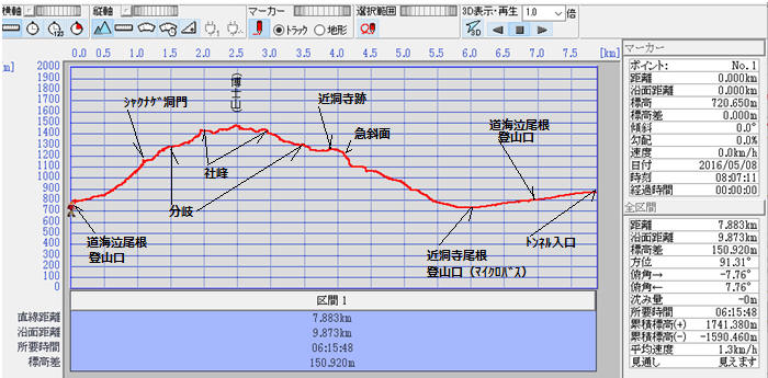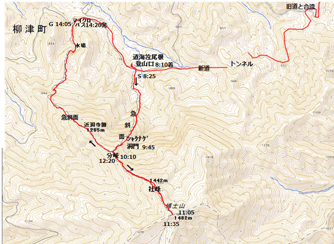 コースは道海泣き尾根登山口から登って、近洞寺尾根を下る。