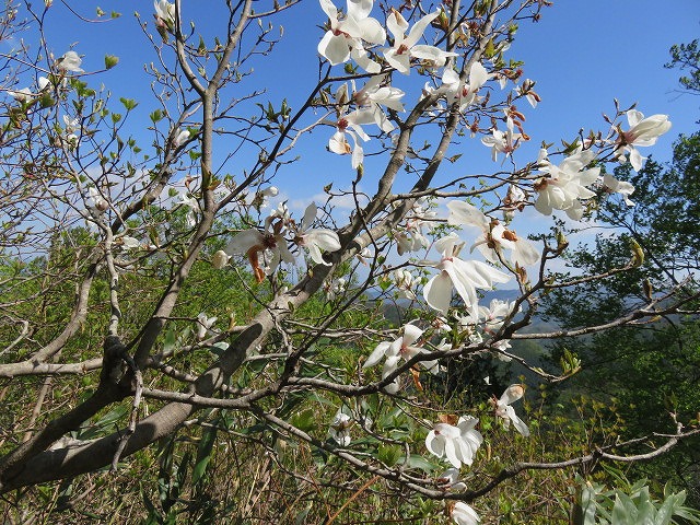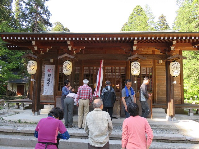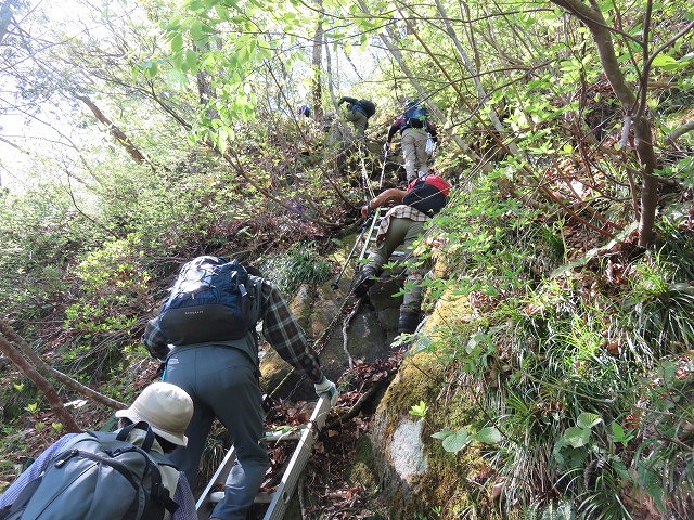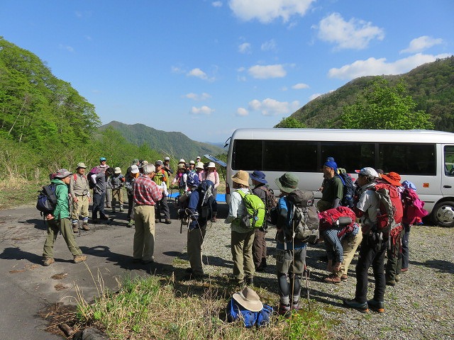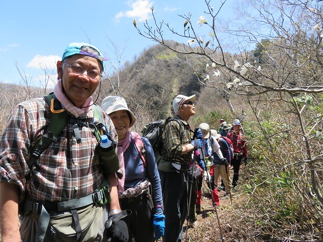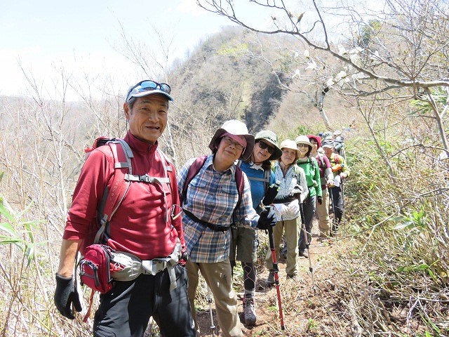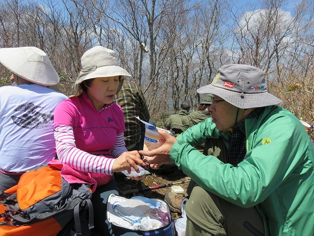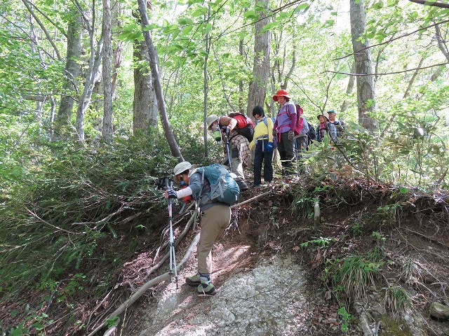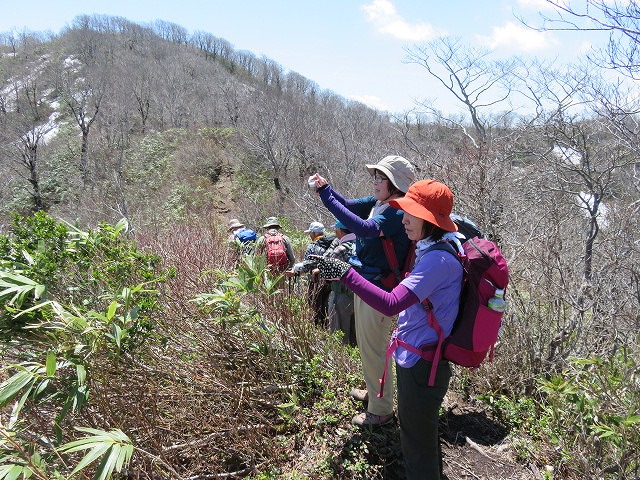 | 東北一円が晴との予報が出ており、20人ずつ2台で出発する。登り口に予定より1時間余早く着く。会長から、山名の由来(太刀を「佩かせ」が「博士」になった)を聞いてスタートする。ブナの新緑が美しく爽やかな風が心地よい。ムラサキヤシオツツジ、タムシバが緑に映える。間もなく「道海泣き尾根」の名に恥じない岩場の急坂を、木の根、ロープ、鎖を頼りによじ登る。時間に余裕があるのでゆっくり行く。イワナシが多い。しゃくなげ洞門(今は立ち入り禁止)を右に見る。シャクナゲの蕾が目を引く。急坂が終わり下山路との分岐を過ぎ、社峰を越えたら山頂である。飯豊連峰、磐梯山などがうっすらと望めた。他に登山者がいないので、40人が狭い山頂を独占してお昼にする。分岐まで戻り、近洞寺跡尾根を下る。こちらも急だが岩場がないので助かる。クロベの巨樹が次々に現れ、中には形が複雑で説明に困る樹もある。ゆっくり下り予定より1時間早く車に着く。時間があるので、会長の発案で会津美里町の、博士山ゆかりの伊佐須美神社に詣でる。社殿が2008年に焼失し仮社殿を設け、再建のための募金集め中とのこと。往路と同じ道の駅に立ち寄り無事、県庁に帰着。新緑を楽しんだ良い山でした。 |