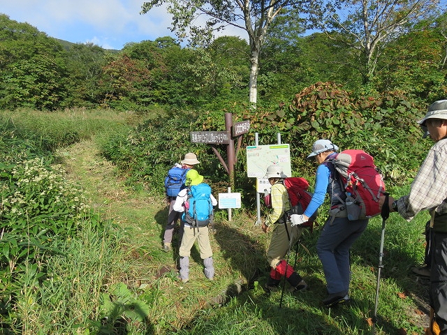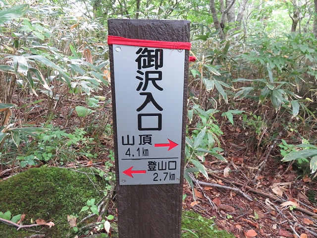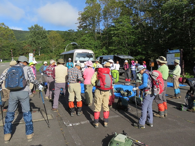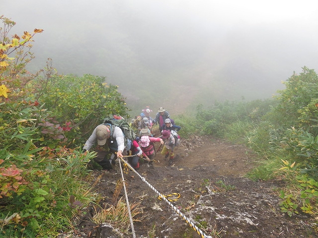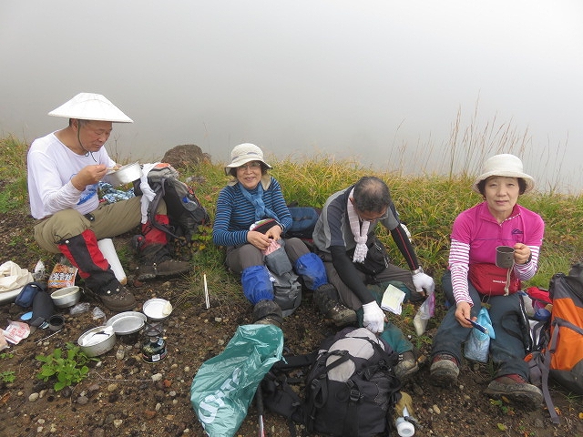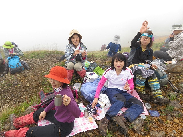 | 9月24日 | 県庁 5:05==長者原SA 6:45==登山口 7:50~~御沢出合 9:10~~大日沢出合 11:40~~12:55 御室下のお花畑(昼食)13:30~~御室 13:45~~須川分岐 14:50~~15:15 山頂 15:20~~16:25 いわかがみ平 16:40==長者原SA 18:05==県庁着 19:30 |
