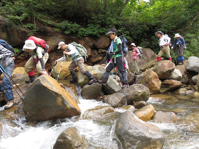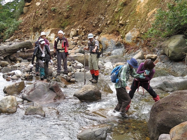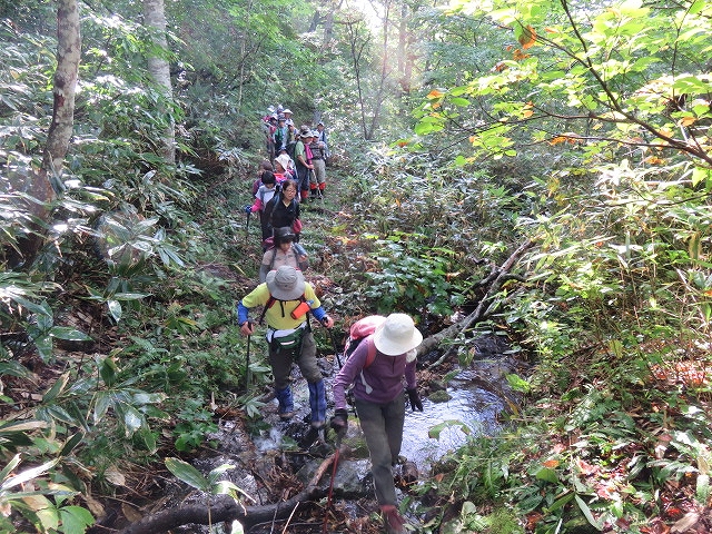 栗駒山は、会員の方なら何回も登った事があると思われるが、今回の御沢(表掛)コースに行った方は少ないと思う。 出発前に、会長より挨拶がある。今日の表掛コースは、2008年の岩手宮城内陸地震で閉鎖になり、5年後の2013年に再開したとの事。登山口は標高800mであり、山頂までは800以上の標高差がある。そして、沢が200mあり気を付けるよう注意があった。 登山口は、刈払いがされ、ブナ林帯を順調に御沢まで行く。沢に出ると一気に景色が開け、そこでしばしの休憩。ここから「石飛八里」といわれる、本格的な沢歩きが始まる。巨レキの沢のルートを探しながら登る。ワクワクして楽しい。10数回の渡渉を繰り返し、水の洗礼を受けながら、会員の手助けを借りて、大日沢出合までたどり着く。 沢の最上部のハシゴ滝から、左の巻き道のロープを登ると滝の上部に出る。平坦なせせらぎを通り過ぎるとダケカンバの林が広がり、ロープのある急斜面が数か所ある。登りきると草原が広がり、気分も爽快だ。もう、すっかり秋の装いになったお花畑で昼食を取っていると、下方からガスが上がって来る。 御室の直下には、チョウジギクやシロバナトウウチソウ等が咲き乱れる。 御室の岩壁から虚空蔵十字路を目指す。登山者が少ない為、ルートが判りにくく苦労をするが、無事、須川分岐に着き一安心。 紅葉が始まった山頂で記念写真を撮り、すぐに、こまくさ平へ下山する。 登りの御沢コースが7時間25分、下りの中央コースが1時間05分。 同じ山でも、コース取りによって、ずいぶん時間が違う事を改めて思い知らされた。 |