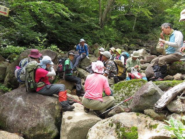 御沢からの分岐点で一息。標高差200mの沢登りに、2.5時間費やした