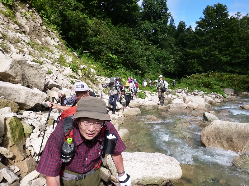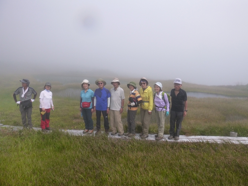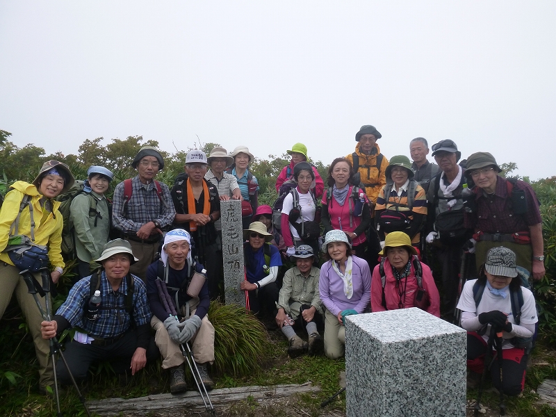 今日の目的地、虎毛山にバス一台で出発。登山口の手前の駐車場で下車、会長の挨拶で虎毛山の由来と阪神タイガーズが優勝した時、虎が付く山で日本で一番高い山がここ虎毛山なので、お祝いに関係者の方々が登ったという話を聞き出発。左手に赤倉沢の川の流れを見ながら、緩やかな道を暫く歩く、純白のウメバチ草が咲いていた。赤倉沢に架けられた木の橋を渉ると渡渉点に着く、ここから高松岳分岐まで展望のない急登を600m一気に登る、なにせ暑い!でも高松岳分岐に着くと、夏の終わりを感じる時折吹くさわやかな風がここちよい、避難小屋が見えたらまもなく山頂到着。湿原に敷かれた木道で昼食を頂く。小屋で会長のお話の、阪神タイガーズの大きな黄色の垂れ幕を見つけました。帰りは登ってきた道をひたすら下る、ほとほと嫌になった頃渡渉点に着き、冷たい川の水で癒され元気が出る、無事到着。 南の方は台風が来てるというのに、恵まれた山行になりました。 〔今日出会った花・木〕 サラシナショウマ・リョウブ・ノリウツギ・クロヅル・テンニンソウ・ツリフネソウ チョウジギク・ゴマナ・オトコエシ・ウメバチソウ・他 |