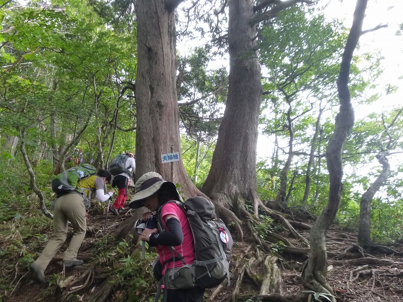 ‥‥赤倉沢登山口08:00‥‥水場(トラの滴)08:10‥‥赤倉沢渡渉点08:40(休憩) ‥‥ 桧林09:15(休憩) ‥‥夫婦桧‥‥高松岳分岐10:30(休憩) ‥‥虎毛山山頂11:35(昼食)12:30発‥‥高松岳分岐13:10(休憩) ‥‥休憩13:55‥赤倉沢渡渉点14:40‥‥水場(トラの滴) ‥‥登山口着15:40発15:50==道の駅おがち小町の郷16:30==県庁着18:40 |