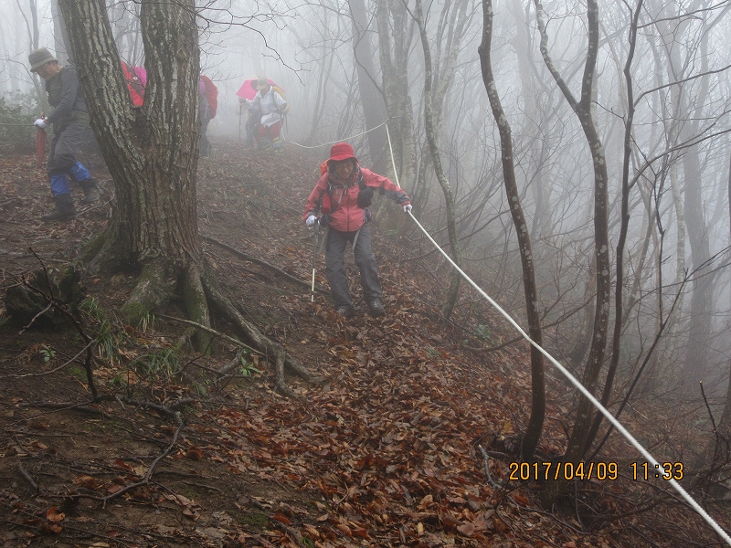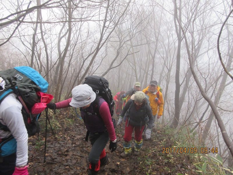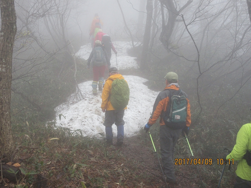 2017年度初の山行・当会の山開き。日本一の小さな山脈へということで期待が膨らむが、天気はあいにくの予報、曇天に霧も立ちこめている。登山口に着くころにはお湿り程度の雨が降り出した。関沢森林公園入口の周辺では水芭蕉が見ごろを迎えていた。 関沢登山口でリーダーの話。櫛形山脈は日本一小さい山脈で、南北約14㎞、最高峰は568m。では日本一長い山脈はどこか・・・。(さすがリーダー、ちゃんと調べてきました!)奥羽山脈が約500㎞。青森から栃木まで!とのこと。現在地点は標高200m程なので、標高差はあまりないが、コースの状況によっては、ルート変更もありうるとの話があった。新人さんの紹介のあと登山開始。 関沢登山口より大沢尾根コースへ。杉林から雑木林へ、マンサク・ユキツバキ・ショウジョウバカマなどに早春を感じながら登る。少しずつ斜度が増し、汗ばむほど。大峰山分岐を経て程なく櫛形山山頂着。濃い霧の中で展望がきかず、期待していた飯豊の山々や二王子山などを仰ぐことができない。短い休憩ののち先を急ぐ。山頂から少し下った平坦地が中世の山城「タカツムリ城址」とのことだが、余裕がなく通過したため、気づかなかった。イワウチワ・キクザキイチゲなど、可憐な花が咲いている。稜線上の快適な道のあと、市の沢分岐あたりからは結構な量の残雪がでてきた。ロープが張ってある急な下り坂が現れ、緊張しながら慎重に歩を進めるが、粘土質の土に足を取られ、ドロドロで滑りやすい道のアップダウンは結構ハード。ロープがあって助かった。雨と霧のため途中展望が開けず、我慢・忍耐の行進となる。 飯角分岐からしばらく稜線上を北進。坂井越を少し過ぎたブナ林のところで昼食休憩。雨中、傘をさしての食事となる。じっとしていると寒さを覚えるほど。 帰路は、悪天候・足元が悪いことなどから、飯角分岐まで戻って下山することとする。飯角分岐からのルートも急坂が連続し、緊張を強いられる。ロープがあっても大変なところもあった。途中休憩しながら下山。オクチョウジザクラが少し咲いていたのに癒された。 初級の山とはいえ(新潟の山のグレーディングで体力度1・難易度A)、天候その他の条件によってはハードな山行となること、低山とはいえ、侮るべからずということを思い知った山旅だった。櫛形山脈は今回のルート以外にも魅力的なところがいっぱいあり、山の自然のみならず、史跡としてもおもしろそうだ。条件が良ければ飯豊の山々ばかりではなく、日本海・佐渡が島などの展望も期待できそうである。大峰山一帯には様々な桜が自生し、「大峰山橡(トチ)平(ダイラ)サクラ樹林」は国の天然記念物に指定されているとか。山開きは4月29日、そのころには桜も咲くのだろうか。ぜひ再訪したいものである。 |