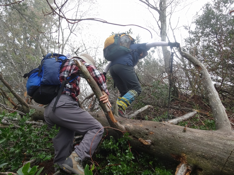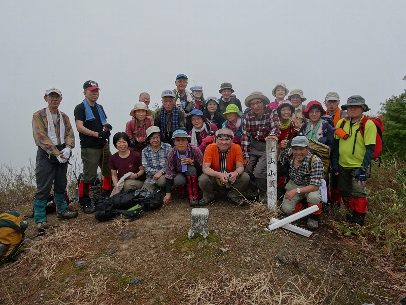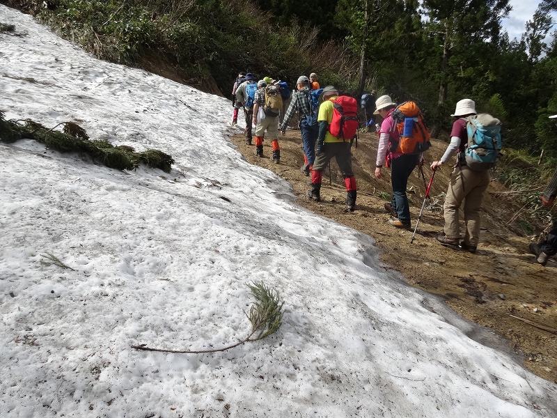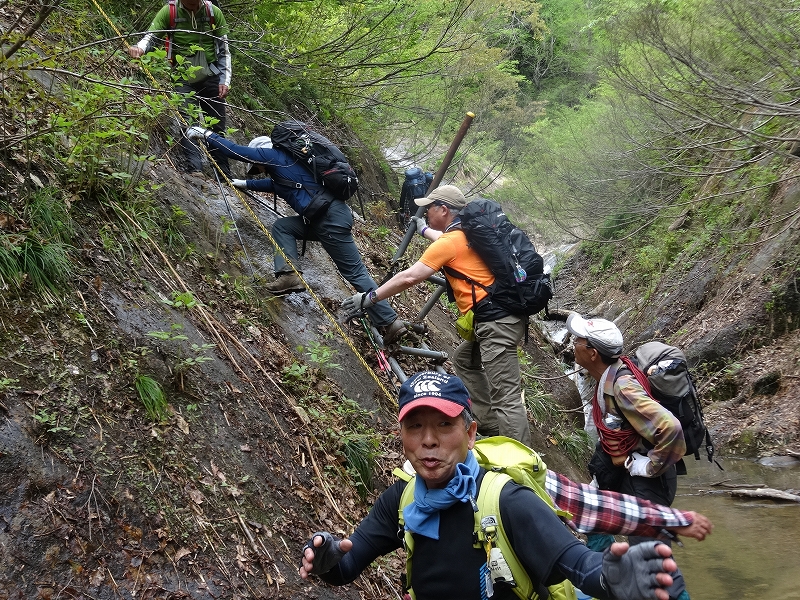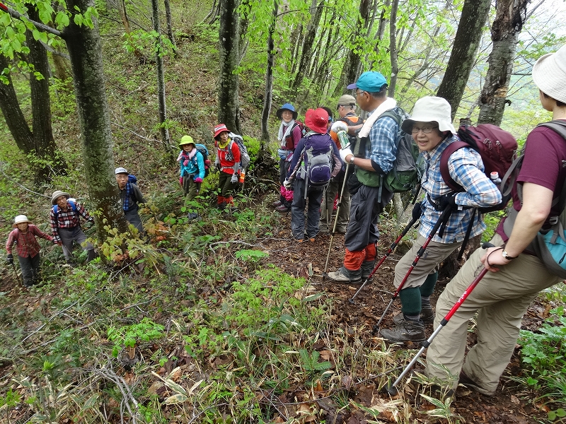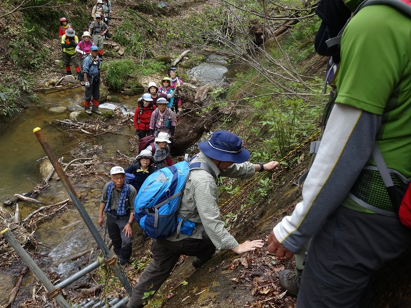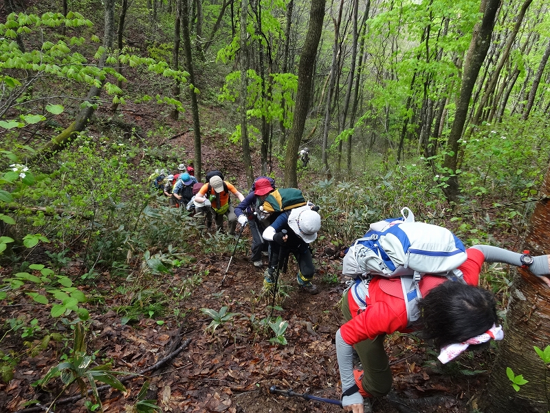 兜山 会長より挨拶(兜山は米沢から見ると兜の形に似ているとの説明)、標高差約600m 林道の橋を渡り杉林の 中を歩く。林道終点から前日の雨で滑る沢沿いを登る。所処にロ-プあり尾根へ、尾根からは、ますますの 急登連続で所々にロ-プあり、木の根に滑りながら登る。途中、残雪が少し在りコブシの花が咲き始めていた。 山頂からは、霞の上で何も見えない。早めに下山をする。 天狗山 会長より挨拶(計画変更し沢コ-スを登る。事前調査、時間短縮) 二の鳥居から登山道にはいり沢に沿った狭い道、道は、足場も良く,滑滝下で沢を渡る。渡った所が崖下、一番の難所で、ハシコ゛とロ-プで登り上の狭い崖道を滑滝の上でトラバースする。 護摩堂からも急登が続き、姥神の所の崖をロープ利用して上がる。 急登はここまで、登山道は足場が切られよく整備されていた。途中の窪地に残雪が多くあり、イワウチワ、椿が咲いていた。 天狗山山頂からは、展望が良く晴れ間に、蔵王山・吾妻・朝日連峰の山々が眺められた。 下山は、途中のロープ・ハシゴの安全を考慮し、護摩堂より林道を歩く。途中にイワカガミの花が多く咲いていた。 |
