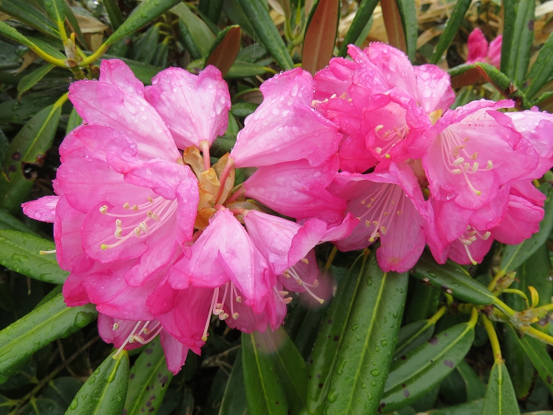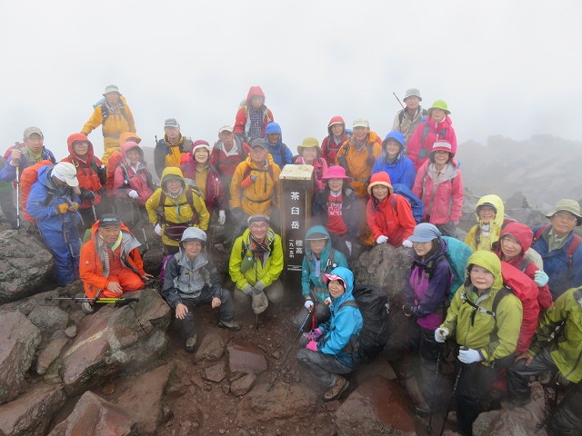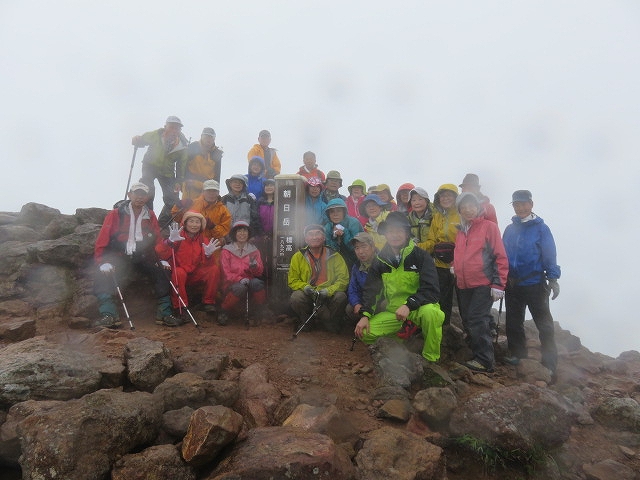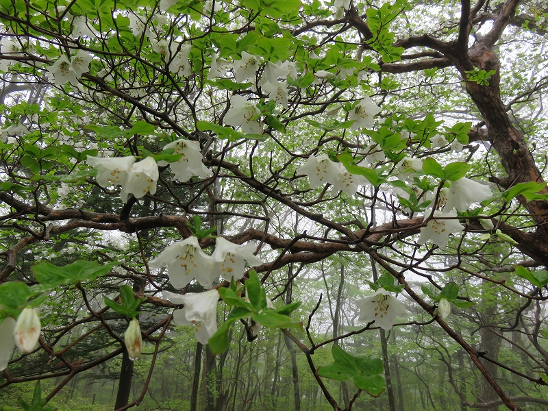 小雨が降る中 栃木県はきっと晴れているだろうと期待しながら中型バス2台はロープウエイの駐車場へ向かうが残念 小雨で山の上はガスで見えない ロープウエイの山頂駅で 会長から 新人さんの紹介と浮石についての注意を受け そして2月に起きた 那須スキー場近くの雪崩れで亡くなった8人の為に黙とうをして出発をする。茶臼岳 朝日岳と石ころゴロゴロのガスで遠くが良く見えない道を行く 朝日岳を過ぎた辺りからコメバツガザクラやミネヤナギ等少しずつ花が見えて来た。 那須岳の最高峰の三本槍岳に着いても まだガスの中で何も見えない 昼食後下山する。北温泉分岐より 緩やかで サクラやシャクナゲが咲く 中の大倉尾根を下りスキー場分岐に着く、 此処からは見事なシロヤシオ並木になる。 そして長い長い駐車場までの下りになるが シロヤシオに癒される。今回の例会から トランシーバーで列の前後等の連絡を取り合ってみた。良かったと思いました。 |