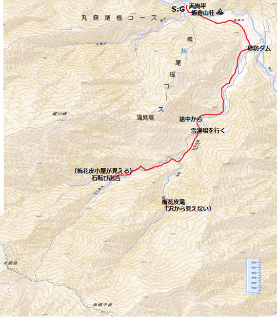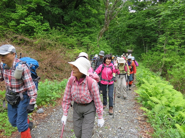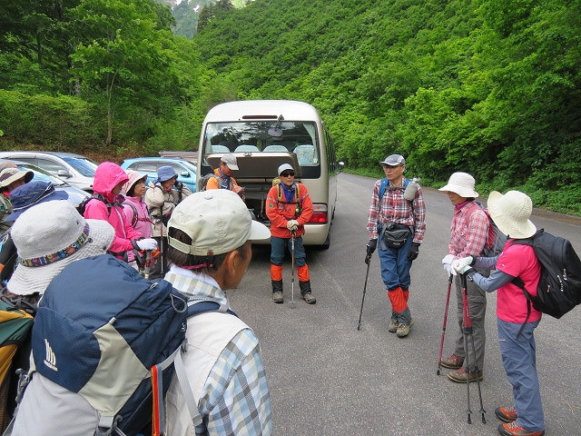 | 6月11日 | 県庁発 6:10==白い森小国7:40==8:15天狗平8:30~~温身平 8:55~~うまい水 9:50~~雪渓に降りる 10:20~~ 11:10石転び沢出合 昼食 11:55~~雪渓の終り 12:30~~うまい水12:45~~堰堤大滝13:25~~温身平 けもの歩道13:40~~14:35天狗平14:50==白い森小国15:40==県庁着 17:20 |