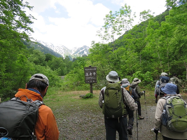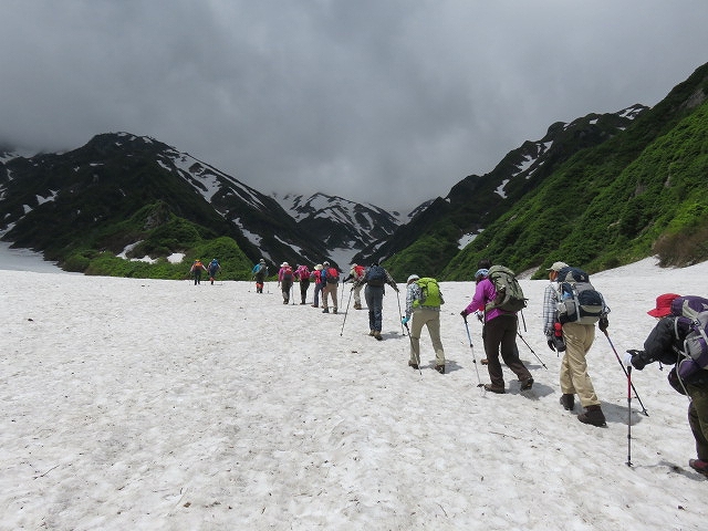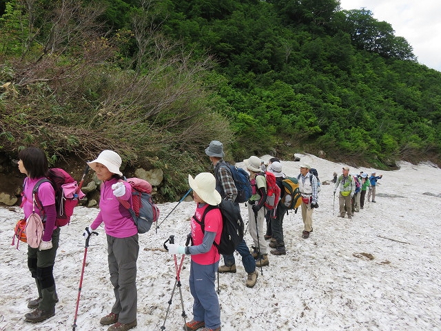 天候にも恵まれ、飯豊の石転び沢の雪渓を登ると思うだけで、心が弾む。 天狗平で白田会長の挨拶。隊列を乱さない事、雪渓を踏み抜かない様にとの注意がある。 天狗平の標高が410m、石転び出合が860m。標高差は450mしかないが、危険度はかなり高い。 温身平までは、車道を歩く。道路の脇にはホウチャクソウなども咲いている。温身平に着くと正面に、残雪を頂いた飯豊連峰が姿を現す。ここで脱タイムを取る。梅花皮沢の渓流の音を聞きながら歩いていると「梓川みたいだね」「上高地に来たみたい」「山形の上高地だ」との声が、あちこちから聞こえてくる。砂防ダムから、登りが始まる。斜面の狭い登山道でのアップダウンは、かなり危険だ。うまい水の看板の所で休憩を取る。冷たくて体にスゥーと入っていく、本当にうまい水だ。 まもなく、雪渓に降りる。あちらこちらに、クレバスがあり、石も転がっており、緊張が増す。リーダーの後に付いて、ひたすら雪渓を登ると、目的地の石転びの出合に着く。いつも見えている巨大な石は、珍しく、今年は雪に埋もれている。到着した時は、なんとか梅花皮小屋が見えたが、すぐに姿を消した。それでも、雄大な石転び沢の絶景が楽しめた。記念写真と昼食を取り、下山を開始する。 最初に沢を渡った所に戻ったらビックリ‼ スノーブリッジに成っており、厚さ50~60cmだった。夏道に迂回する。温身平では、けもの歩道を経由し、ぶな林の森林浴を楽しみ、全員無事下山する。 |