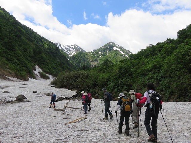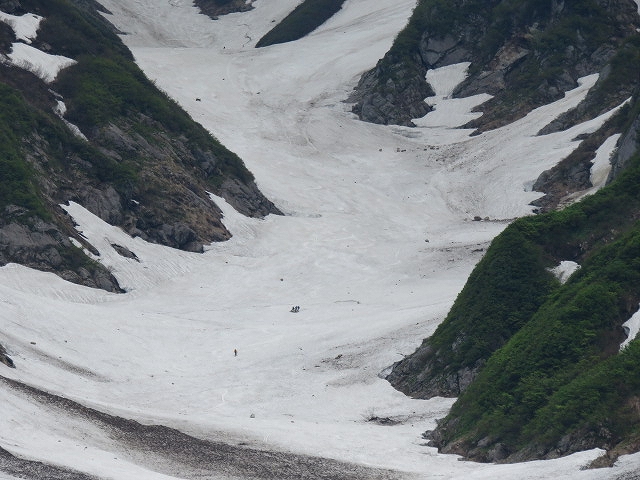 ここから雪渓に入る~コース選定に悩む(正面は門内岳)