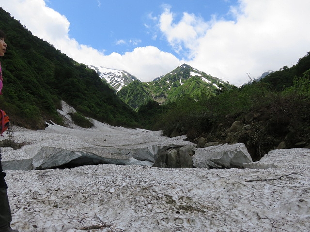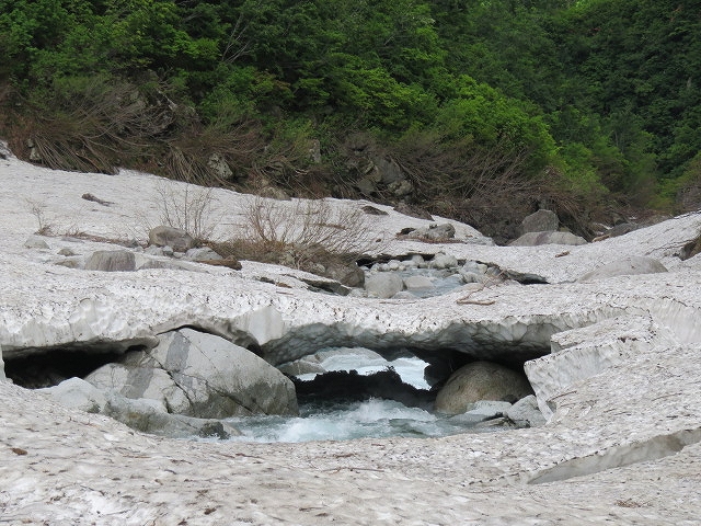 下山途中、朝雪渓を登り始めたところが空洞(薄氷を踏む‥‥)