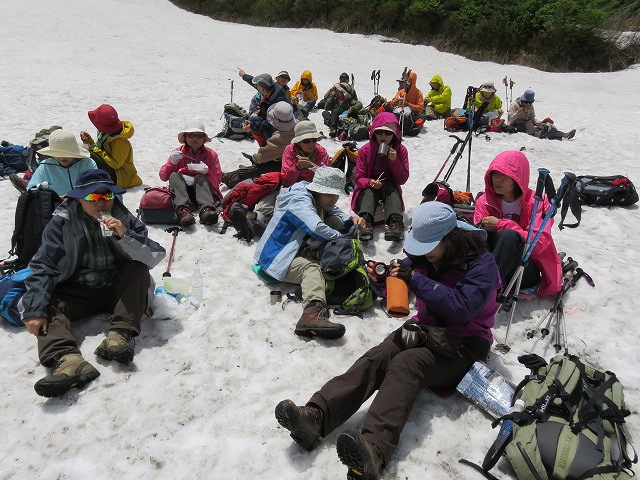 雪渓の上で昼食タイム~かつてのお嬢様方はいつでも日焼けが気になる