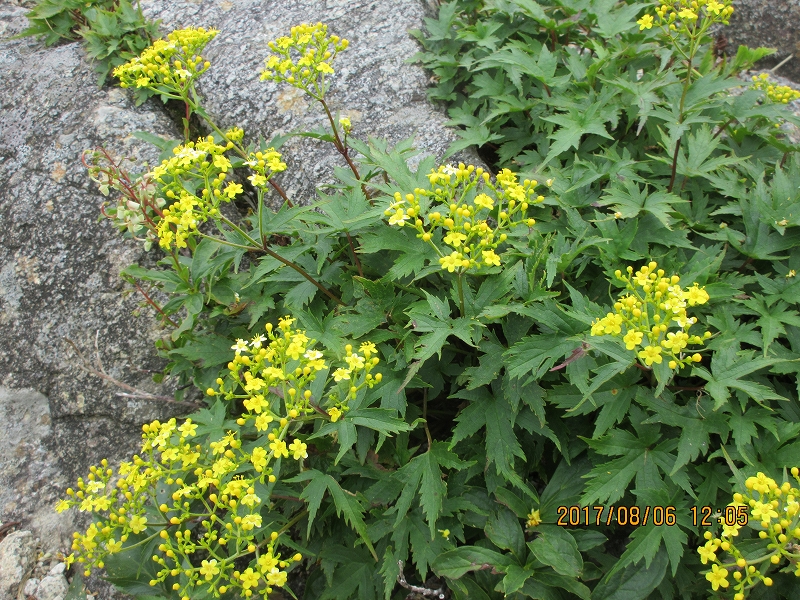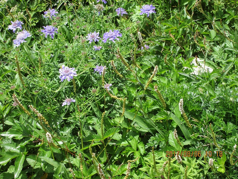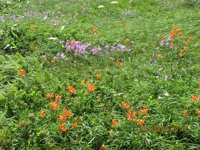 お天気が良いのは嬉しいですが、朝から暑い 今回はブナ峠から出発です。橋のない沢を何回も渡り道に少し迷う やっと登山道に戻りホッとする。なだらかな道を上り湿原に 囲まれ キンコウカ咲く 鳥原小屋に着く 綺麗で宿泊者が少ないのが嬉しいです。次の日の朝 下界は雲海で囲まれていた。今日も素晴らしい天気の中出発する。鳥原山に着く と小朝日岳 大朝日岳 遠くに月山 鳥海と景色が素晴らしい。 熊越に重い荷物を置き ハクサンオミナエシ ハクサンシャジン等咲く道を行き 銀玉水で水を補給しマツムシソウ ニッコウキスゲ ウサギギク ミヤマクルマバナを愛でながら大朝日小屋に着く。 小屋の周りにもハクサンフウロ クルマユリ タカネナデシコ等が咲いている。山頂で昼食にして下山する。熊越で荷物を取りやっと駐車場に着くと 運転手さんの甘くて冷えたスイカとジュースの差し入れにびっくり 今年も有難うございます。 |