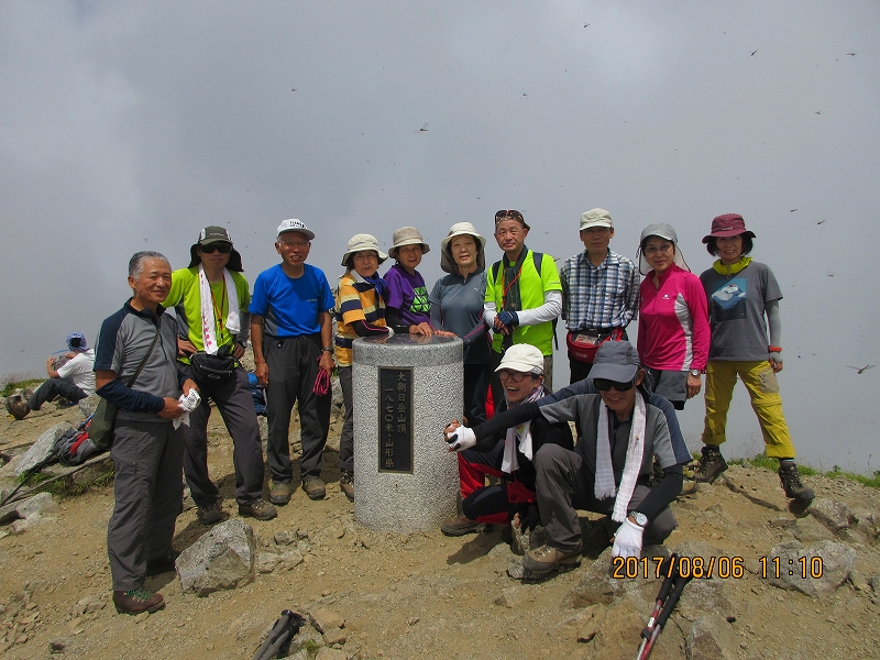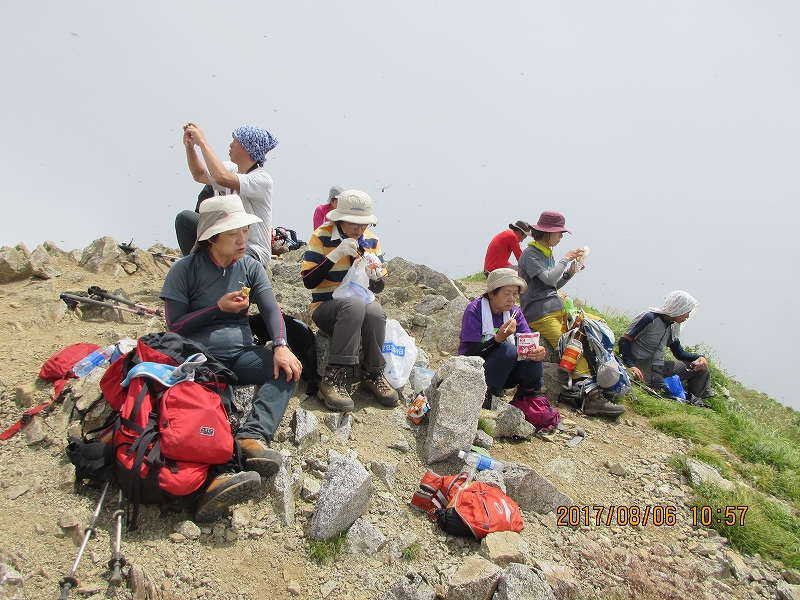 大朝日岳山頂にて昼食タイム~残念ながらガスで眺望が利かない