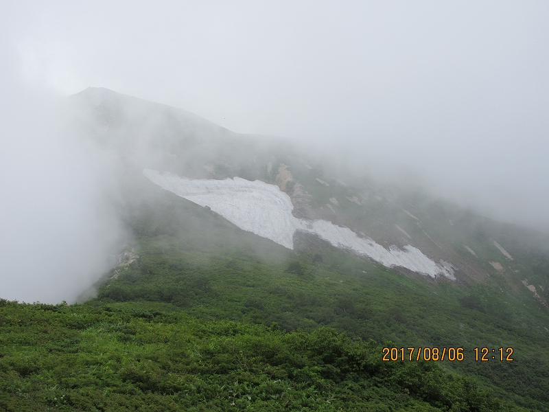 松茸の雪渓がやせ細り矢印になっている~方向は大朝日岳山頂を指している