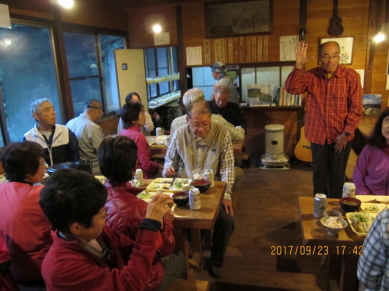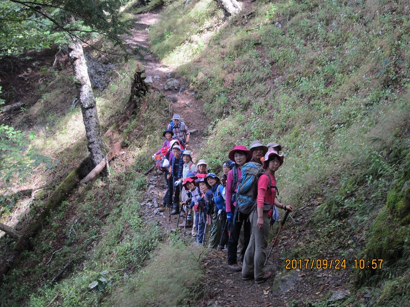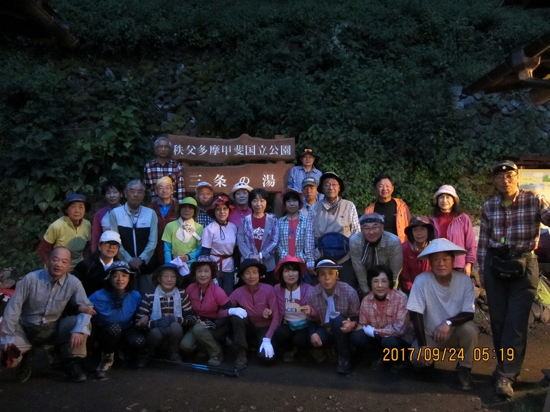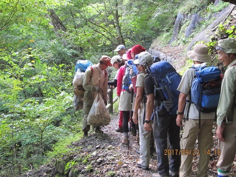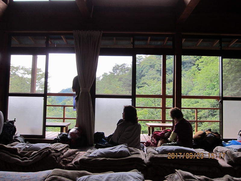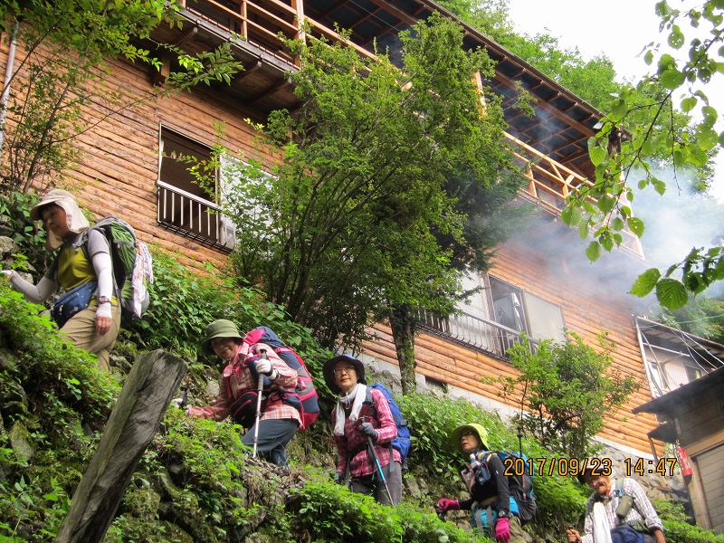 | お祭り登山口に着いた時には天候も回復、期待に胸を膨らませて今夜の宿、三条の湯へと登山開始。乗用車なら片倉橋のゲートまでは車が入れそうだが、マイクロバスは入れない。だらだらの登り道、林道をひたすら歩く。蛇や大きなカエルの歓迎を受け、後山川の沿いの美しい広葉樹の森、清流を楽しみながら、林道の終点までは約3時間の道のり。山歩きには慣れている会員も、長い林道歩きには少々バテてくる。東京水道水源碑のある林道の終点、青岩谷橋からは歩きやすい山道を三条の湯まで約30分。深い谷底には清流が淵となり、滝となり、美しい景観である。途中、大荷物を背負った男性と会う。荷はマイタケ!今夜はマイタケのごちそうか?と期待が膨らむ。「やまなしの森林100選、三条谷の広葉樹林」との看板。山梨県側であるが、東京都が購入した東京都の水源林であるらしい。テント場からすぐ今夜の宿、三条の湯着。鹿の湯ともいわれる三条の湯は源泉10℃の鉱泉、沸かし湯である。林道歩きでの疲れを流し、お肌もツルツルにしてくれる癒しの湯である。夕食は竈焚きのマイタケごはん、社長御手討ちの鹿肉のロースト、自家製野菜のサラダ、マイタケの天ぷら等、山小屋とは思えない豪華さ。部屋は我々のみの貸し切り。ラッキー!消灯は21:00であるが、翌日に備えて皆早々と就寝した。 |