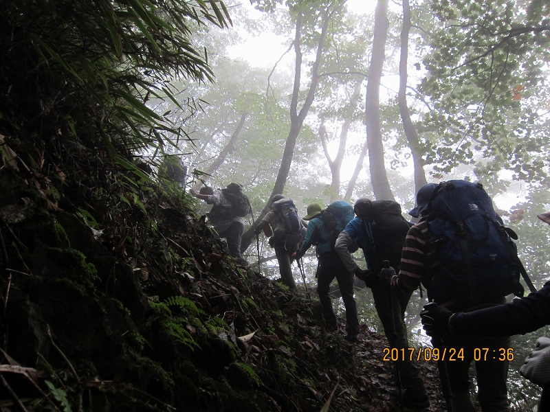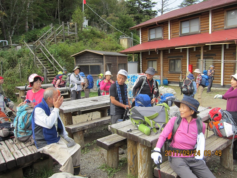 | 9月24日 | 起床(4:30) 朝食(4:50) 出発(5:15)…… 脱ぎタイム(5:29~5:35)…… ヘッドランプしまう(5:45) …… 休憩(5:50~6:05) …… 休憩(6:52~6:58) ……三条ダルミ(8:03~8:12)……雲取山山頂避難小屋(8:56) ……雲取山山頂着 H2017m(9:00~9:15) …… 雲取山荘 休憩(9:38~9:45) …… 男坂・女坂分岐 女坂へ (9:52) …… 大ダワ(10:07) …… 芋ノ木ドッケ 昼食休憩(11:05~11:40) …… 白岩山H1921m(11:44) ……白岩小屋(12:00) …… 白岩山 |