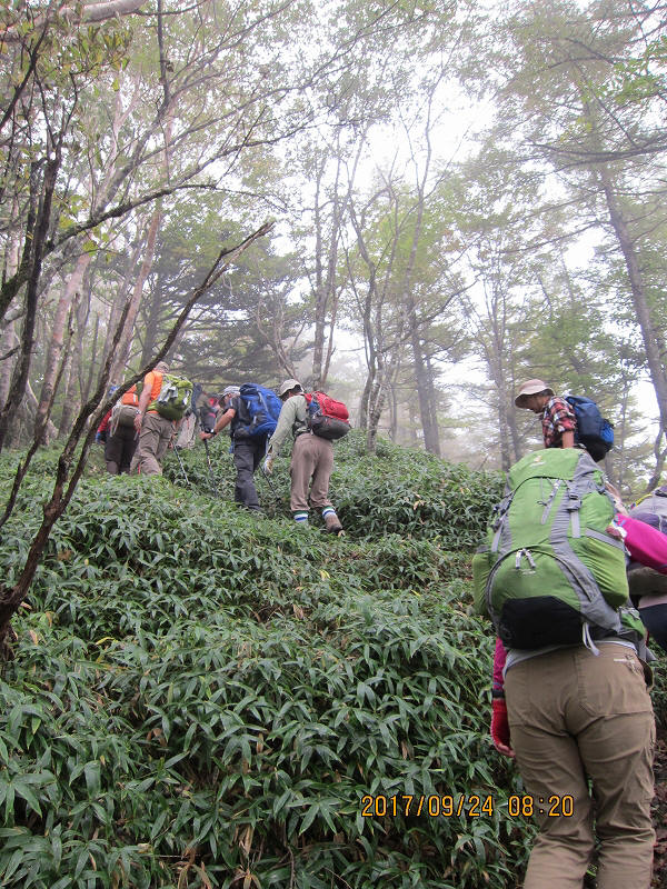 | 4:30起床、4:50には朝食。5:15 朝霧が立ち込め、まだうす暗い中を登山開始。木道のかかる小屋の取水沢(三条沢)を慎重に渡り、水無尾根へ。三条ダルミへは緩やかなアップダウンの快適な道。霧の中、富士山の絶景ポイントの三条ダルミからも、展望は開けない。林床にはあまり草が生えていなかったが、このあたりから笹が生え始めた。この先は、山頂に至る急登。途中倒木に阻まれたりしながらも、山頂避難小屋着。ここが山頂と思いきや、あとほんのひと登り。 |