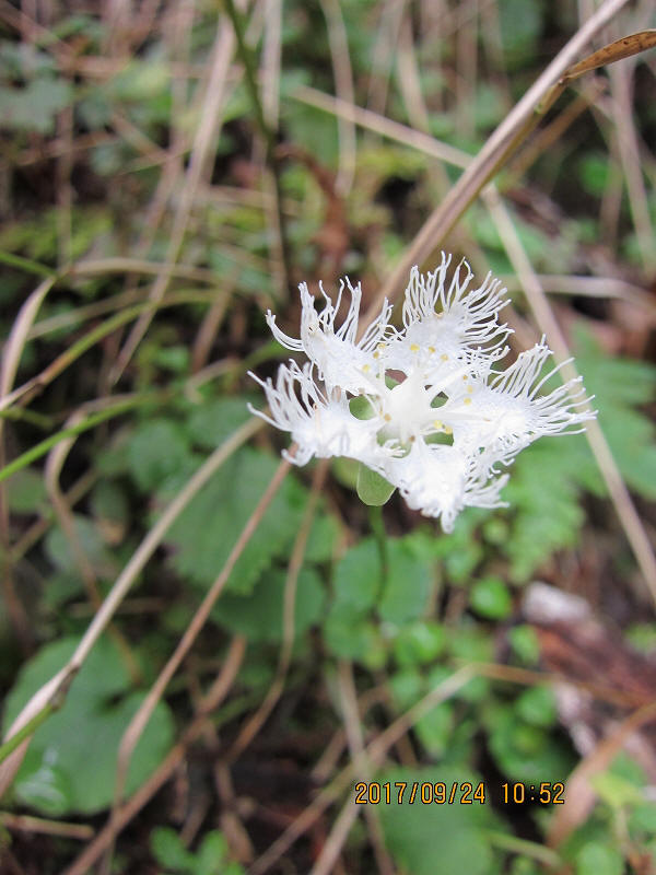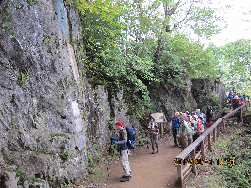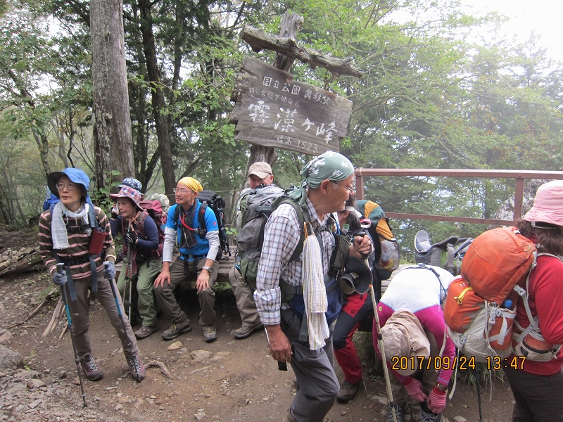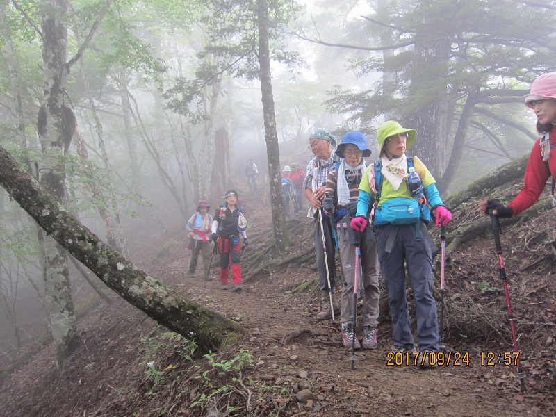 | 2017m無事登頂。雲取山は明治16年の「全國三角測量」により設置された「原三角測點」と、国土地理院の一等三角点があり、測量の歴史的にも貴重な場所だそうである。富士山の絶景を期待していたが、ここでも残念。記念撮影をし、それぞれの思いを胸に山頂を後にした。雲取山荘へはやや急な下り。雲取山荘は通年営業の山小屋。小屋の前には水場があり、おいしい水をいただいてゆったり休みたいところだったが、少々遅れが出はじめ、短めの休憩後、先を急いだ。男坂・女坂の分岐。やはりここは女坂でしょ!薄日が差しはじめ、木漏れ日がうれしい。大ダワから白岩山悪場あり 足元に十分注意との道標あり。途中、探し求めていたシラヒゲソウ発見。花弁が髭のように裂けレースのよう。カラスウリの花を小さくしたような可憐な花、神の御業かと思う不思議な姿であった。美しい原生林を進み、芋の木ドッケで昼食休憩。ここから白岩山はすぐ。ちょっと下ったところに白岩小屋があるが、荒廃しており、緊急時以外使用不可。前白岩山の肩からお清平への道は足場の悪い難所で、慎重に下る。小休止の後、霧藻ケ峰への登り返し、休憩所あり。テラスからは北西の展望が素晴らしいとのことだが、ここでも雲にさえぎられた。山頂にあった一年間限定の記念碑「雲取山西暦二千十七年記念」の存続のための署名を求められた。直下の岸壁には秩父の宮のレリーフがあった。霧藻ケ峰の名は秩父の宮が登山された際、命名された由。それを記念して建設されたとのこと。再びガスが濃くなってきて、「ホント、霧藻ケ峰だわ!」とのつぶやき。何やら薄暗くなってきて、夕暮れ時のよう。地蔵峠を経て、ひたすら下る。杉や檜の美林の森が広がる。鹿の食害を防ぐためか、幹にネットが巻かれている。妙法ケ岳分岐の奥宮の鳥居を過ぎ、しばらくして鳥居をくぐれば三峰ビジターセンター、下山完了。予定時間よりは若干遅れたものの、全員無事、元気にロングコースを踏破できたことがなによりであった。 |