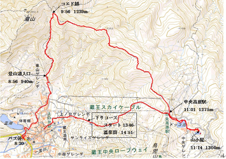 | 10月7日 | 蔵王温泉バスターミナル08:17発08:40‥‥竜山ゲレンデから樹林帯へ09:00‥‥9:50コエド越10:00‥‥スカイケーブル11:00‥‥ドッコ沼11:15‥‥山形山岳会小屋着11:20 芋煮会 13:50‥‥蔵王大権現堂14:10‥‥上ノ台14:50‥‥酢川温泉神社14:55‥‥蔵王温泉バスターミナル着15:10 |