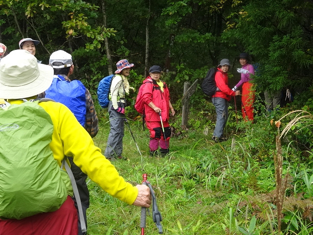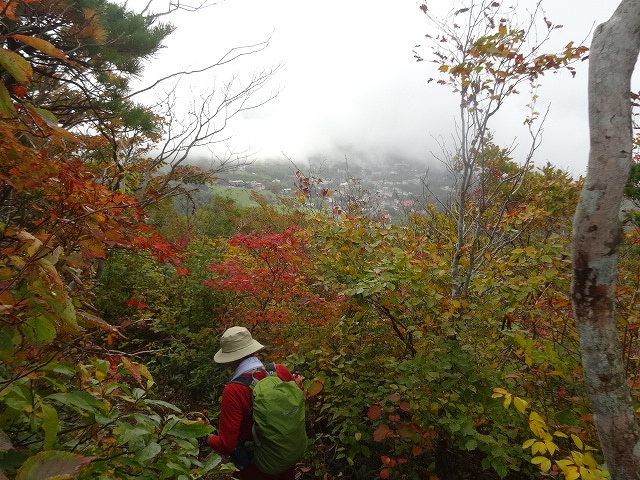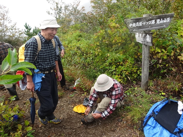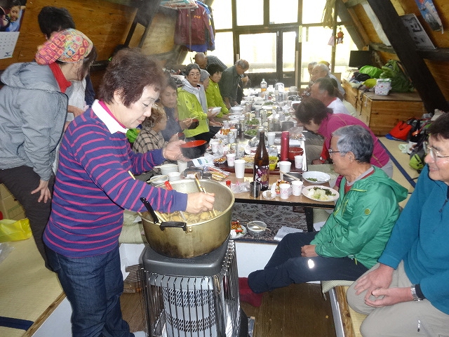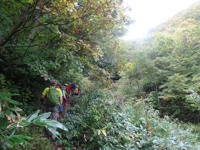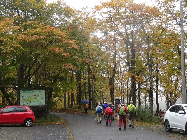 今日は、蔵王での芋煮会。しかしながら、小雨が降っている。蔵王温泉バスターミナルで完璧な雨支度をして待つ。 今回のチーフリーダーの三浦さんより挨拶。霧雨の中を出発するが、すぐに雨が上がり、竜山ゲレンデのリフト乗り場で脱ぎタイムを取る。蔵王のジャンプ台を右手に見ながら、藪をかき分けリフト中間地点位にあるコエド越えコースの入り口を探す。ここから、見通しの効かない樹林帯の中、きつい登りが待っている。ひたすら登ると、やがて明るくなり、宝沢との分岐、コエド越に出る。ここで休憩を取り、右に折れスカイケーブル駅へと向かう。尾根道は、展望もあり、霧の下に温泉街なども見ることが出来た。紅葉が美しい低木帯を進んで行くと、中央高原に出る。標高1264mのドッコ沼周辺では、カエデなどの葉が赤く、ブナなどは黄色に変わり、紅葉の見頃を迎えていた。役員の声に迎えられ、山小屋に到着する。早々に乾杯をして、女性役員が作ってくれた美味しい芋煮を頂く。芋は、ねっとりとして柔らかく、牛肉も美味しい。会員が差し入れてくれた枝豆、わらびの一本漬け、イナゴの佃煮、寒天のデザート、ミョウガの酢漬け、色々な漬物などすごく料理が並ぶ。皆で歌ったりして、楽しいひと時を過ごす。帰りの蔵王権現堂では、吉村県知事と一緒に写真を撮り、ガスの中、バスターミナルに無事に着く。 |