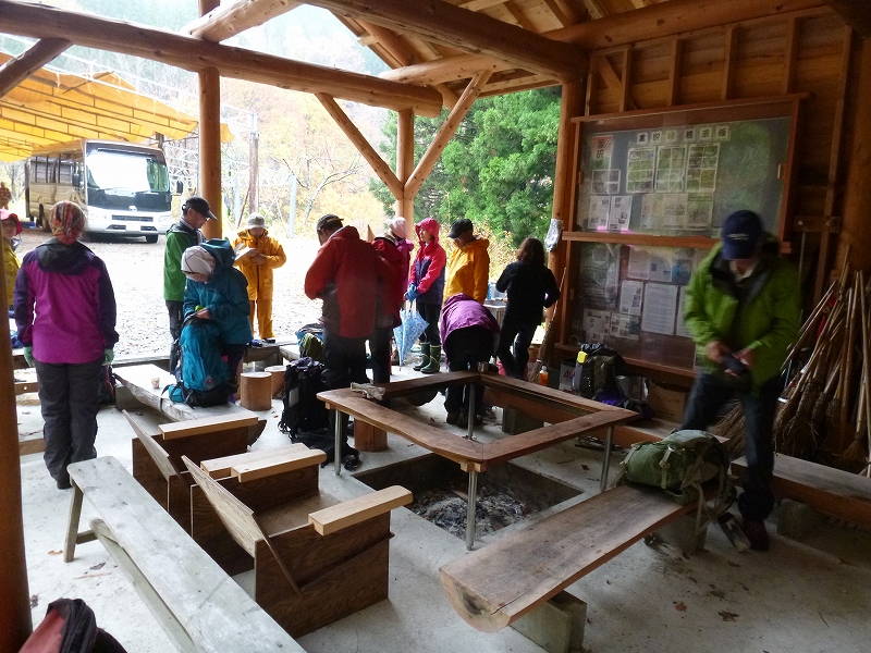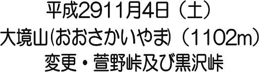 | 11月4日 | 県庁6:10==国道13・113号==小国町ぶな茶屋==8:08大境山登山口8:19==萱野峠玉川8:37~~萱野峠足野水10:20==11:08黒沢峠祭り広場(昼食)11:45~~黒沢峠市野々口12:48==イチョウ広場==飯豊道の駅13:45==小岩沢==川口==県庁15:34 |