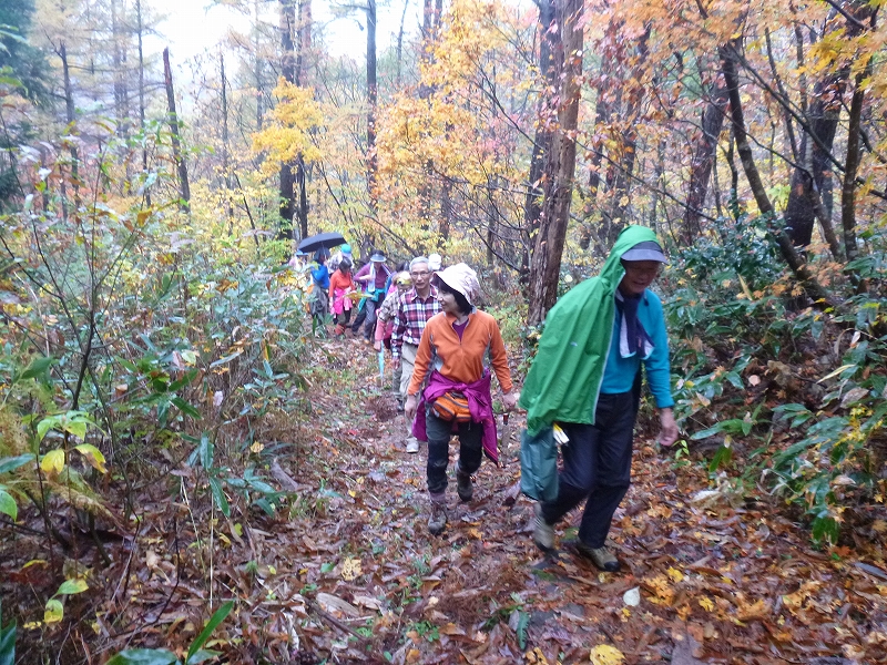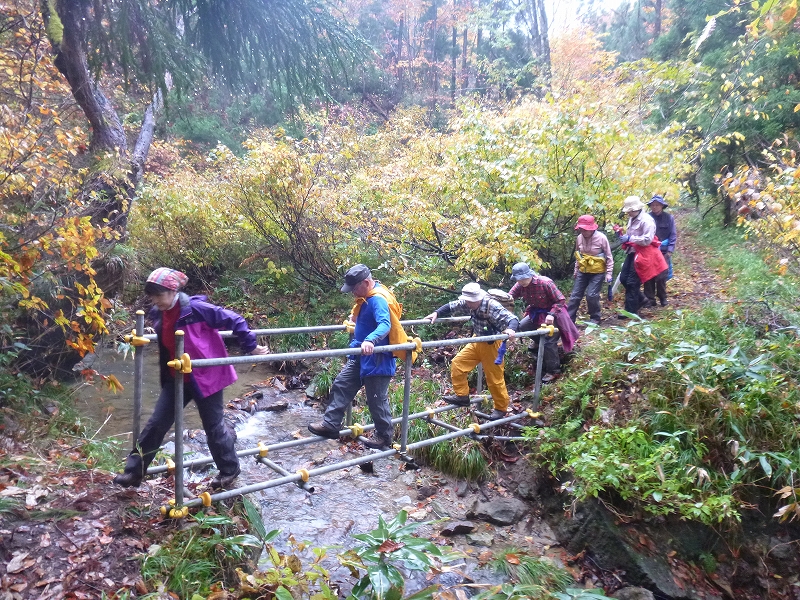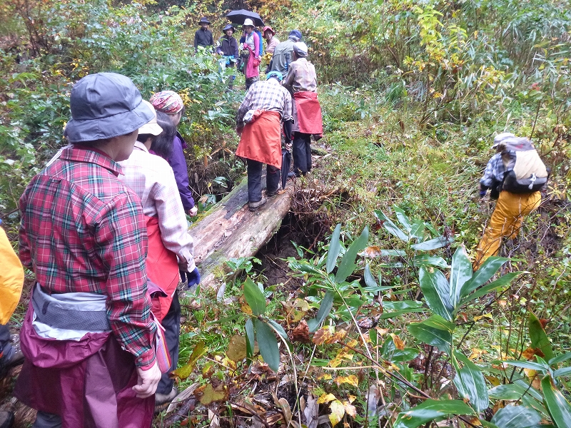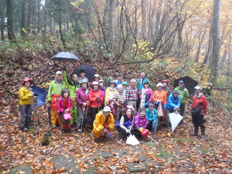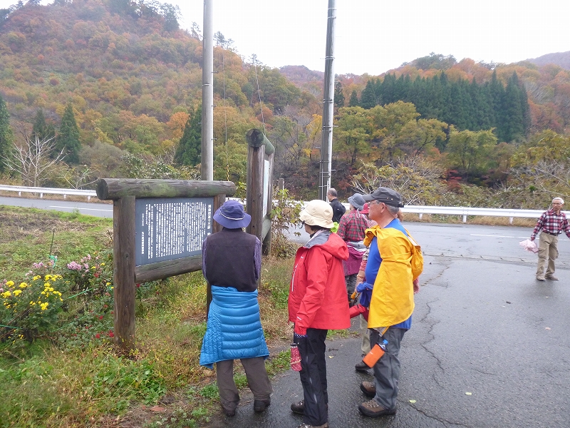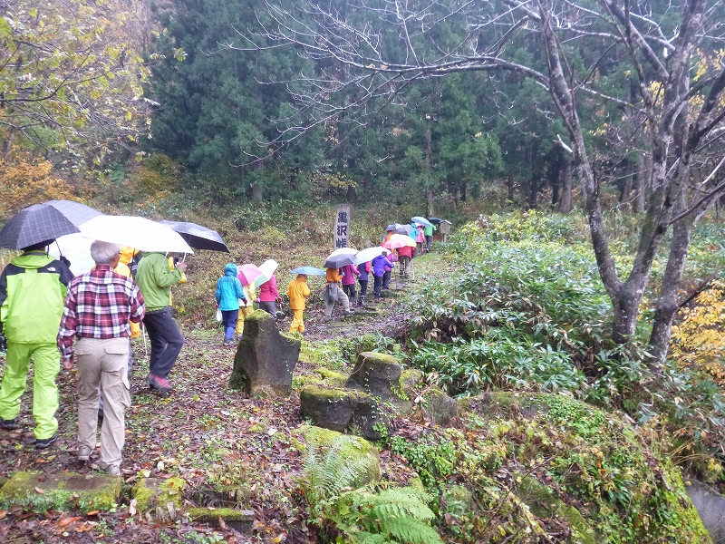 山形百名山である大境山を目指し一路小国町へ。大境山登山道入口に到着すると天候は雨、山にはガスがかかっている。岩田副会長から本日の予定を変更し、越後十三峠の萱野峠(標高278m)と黒沢峠(標高426m)を縦走する旨の説明があった。 敷石道萱野峠玉川から出発、3.2km約80分の行程だ。小雨に煙る中、周辺の景色はブナの黄色やカエデの赤など紅葉真っ盛りである。峠道はぬかるみ、敷石は苔むして滑りやすい。文献によると十三峠は、かつて越後と置賜の物資運搬等のため石を切り出し整備したものとある。明治11年英国の女性旅行家イザベラ・バードがこの峠を玉川から足野水に越えていると記してある。驚くべきは、この敷石道整備の偉業を後世に残すため、地域の人たちが復興に尽力してきたことだ。 時おり雨も止み陽ざしが見え隠れする。次の峠行のためバスで黒沢に向かう。黒沢峠敷石道の出発地点にイベント会場である祭り広場に到着、依然として雨は止まない。大きなテントや炉端がある一角で昼食とする。雨を避け休憩するには格好の場所だ。 さて、後半の峠縦走路である黒沢峠敷石道を出発、2.6km約65分の行程だ。その内、約1.8kmに3,600段の敷石が敷かれているという。この街道を通った著名人として、直江兼続、五郎八姫、西郷隆盛等が知られている。峠道の途中、数カ所の沢にパイプの橋が架けられているが、雪を前に敷板が外されており渡り歩くのに工夫を要する。ようやく峠を越え市野々の駐車場に着く。 帰路途中、横川ダム建設のため白い森おぐに湖に沈む予定の飛泉寺から移設され、見事に色付いた大イチョウを見学。さらに、南陽市小岩沢と上山市川口の石造り眼鏡橋を見て、当時の土木技術の高さに感心した。 奇しくも本日、東北中央道福島~米沢間が供用開始され、国道13号上りがやけに混んでいる。朝から二つの峠を縦走し、今では珍しい石橋も見学した。まさに「温故知新」で先人の苦労に思いを巡らし、「道」造りの大切さと歴史を学んだ道行であった。(秀) |