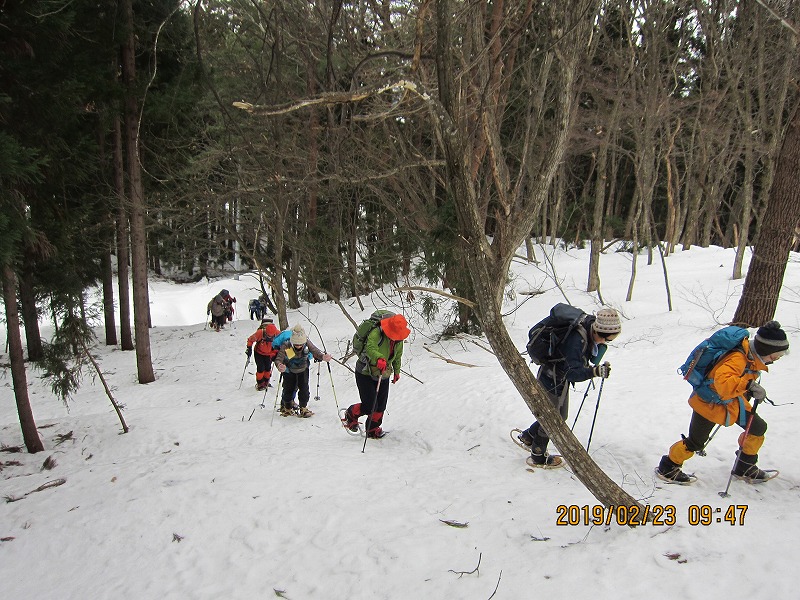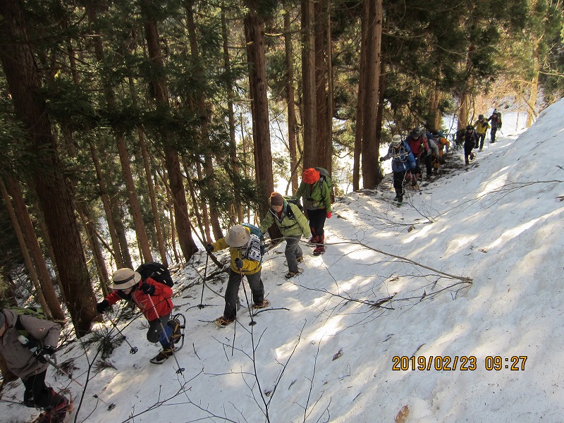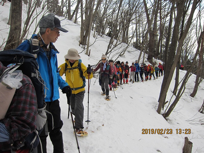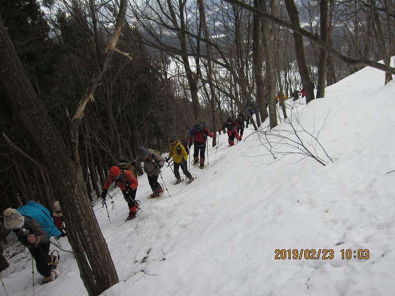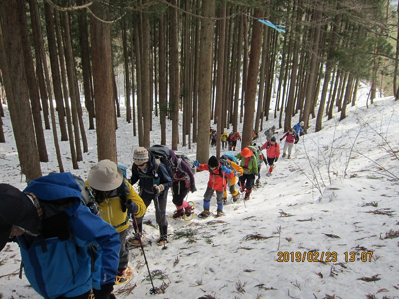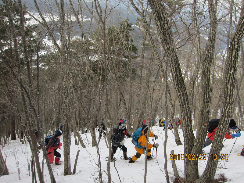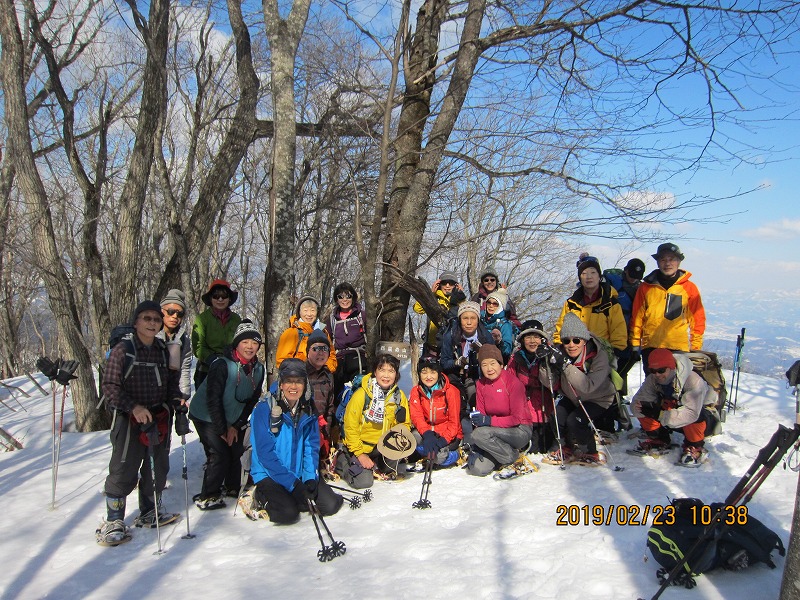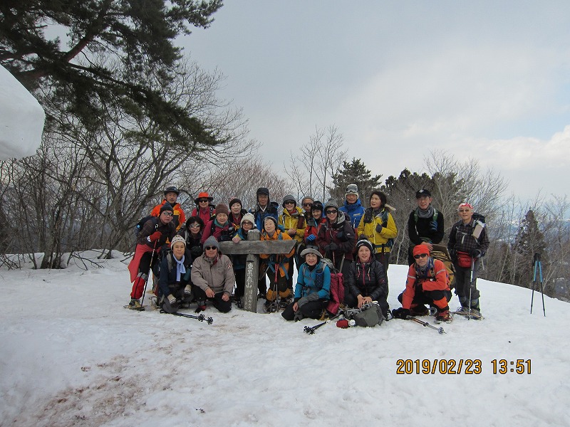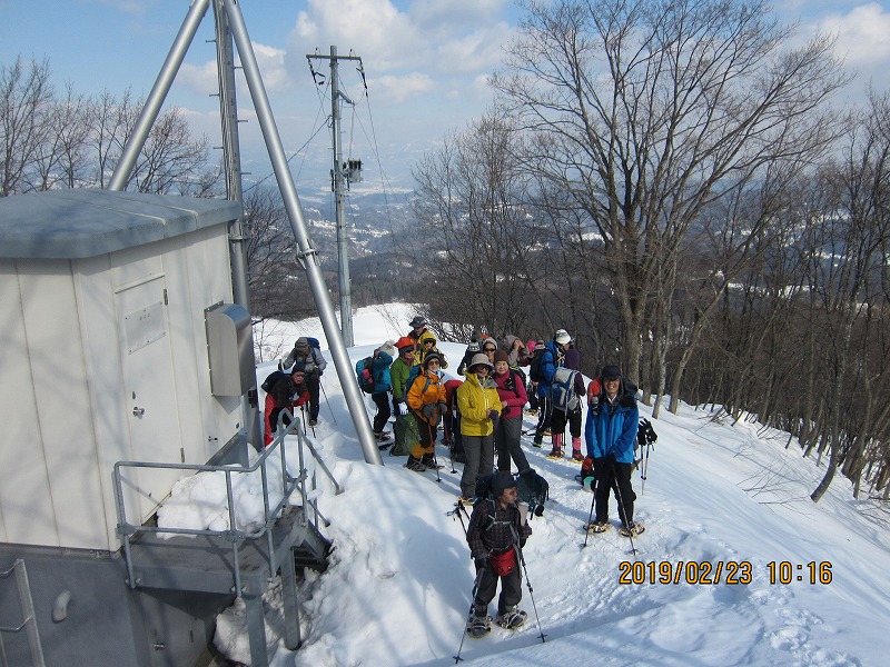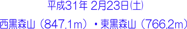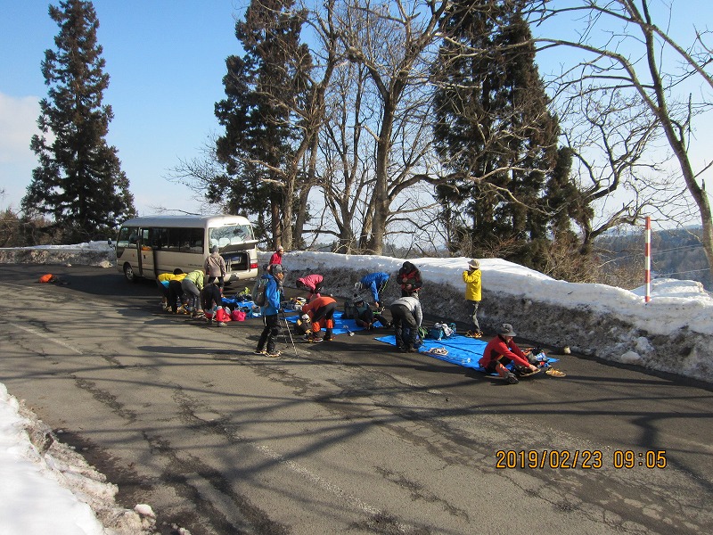 | 2月23日 | 県庁8:05 == 山交ビル8:20 == 県道17号線畑谷集落から鐙坂登山口 8:55 == 登山開始9:13 …… 馬牽高原9:34(休憩) …… 小休止9:54 …… NHKTV中継アンテナ10:14(休憩)……西黒森山山頂10:33 下山開始10:40 …… アンテナ10:57(休憩)…… 馬牽高原11:18 ……鐙坂登山口11:31 == 山形市少年自然の家野外活動センターへ移動 11:55 (昼食休憩)12:35 == 東黒森山登山口13:00 …… 休憩13:19 …… 東黒森山山頂13:46 下山開始13:55……東黒森山東登山口14:16 車発14:25 == 山交ビル15:15 == 給油 15:35 == 県庁着15:45 |