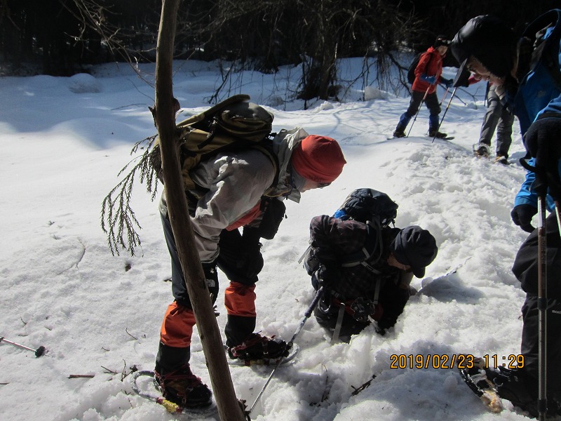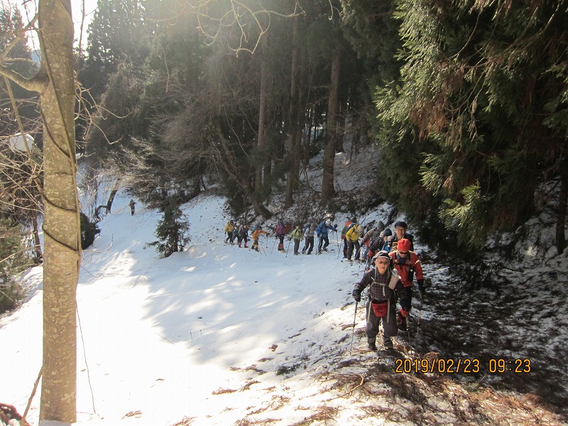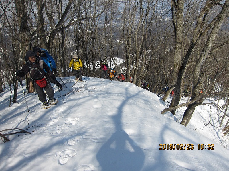 冬山雪山・かんじきウォークの企画。白鷹山周辺の県民の森としてなじみのエリアだが、夏道がないためなかなか登る機会のない西黒森山(藪が雪の下になったこの時期が登山適期〉と、東黒森山(夏道あり)の二座に登る。 このところの春のような陽気で雪解けが進み、山形市内は積雪0センチ、かんじきなしでも登れるかという予想のもと出発。山辺畑谷方面に入ると、結構な積雪。作谷沢集落の家々は屋根に雪を頂いている。集落を少し過ぎ、道路が待避所として幅が広くなっているあたりに鐙坂登山口の看板がある。リーダーが雪の感触を確認、かんじきが必要ということで、準備の後出発。 秋に下見をしたときは藪こぎだったが、今は雪に覆われて、なおかつ雪も結構しまっていて歩きやすい。かんじき無しでも歩けそうだが、ツボ足ではところどころ雪を踏み抜いてしまいそうだ。程なく馬牽高原着。視界が開けるが、雲がかかって朝日連峰や月山などの眺望は得られない。この先、徐々に傾斜がまし、杉林の中をジグザクと進む。林を抜けると北風が吹きつけ、結構寒い。しばらく急坂を登ると快適な鞍部の道に出て、雑木林の隙間から下界の集落が見える。程なくNHKテレビ中継アンテナに到着。これから先は下見の際は本格的な急登の藪道だったが、今回は雪におおわれているので、急登を我慢すれば快適な雪道。動物の足跡が結構あった。肉球がある小動物、タヌキか?との鑑定あり?急登を登りきると緩やかな尾根歩き。程なく西黒森山山頂着。立ち木に山頂の目印がつけられている。樹木の隙間から葉山を望み、下界の景色を堪能し、下山開始。北側は雪庇になっており、また、急な下りなので慎重に下山。テレビアンテナのところで小休止後、サクサクと下山し、馬牽高原着。この先は少し雪が緩み始めていてぬかるところがあった。鐙坂登山口着。 山形市少年自然の家の野外活動センターに移動し、センター2階のホールで昼食をとらせてもらう。冬場は暖かいところでの昼食はありがたい。広いホールなのに、なぜか皆、壁際に陣取って思い思いに食事・・・。 休憩後、再び移動して東黒森山へ。一度リセットした感じになって、少々かったるい。気持ちを取り直し、県民の森、家族広場への道の入り口で登山準備。西線登山口から登山開始。東線登山口への周回コース。こちらは結構登山者が入っているようで、ところどころにツボ足で雪を踏み抜いた跡がある。かんじきでもぬかりそうなところがある。なだらかなトラバースを過ぎ、急登の北西斜面に出ると、急に冷たい風にさらされる。我慢の一登り、山頂手前で若干なだらかになり、避難小屋のある東黒森山登頂。山頂からは雲がかかっていて遠望がきかない。昔は小屋のところに展望台があったが、今は撤去されている。記念撮影の後程なく周回する形で東線登山口へ下山開始。雪がゆるんできて少々重い感じがする。カラマツの林を抜け、一気に下山。家族広場・みこくぼ沼脇の車道にでた。 かんじきでの雪山登山初体験の人もいたが、みんな上手に歩き通すことができた。例年にない小雪ではあったが、雪山体験ができてよかったのではないだろうか。無雪期だけでなく、降雪期に入ってからも下見をして立案してくれたSTさんありがとうございました。 |