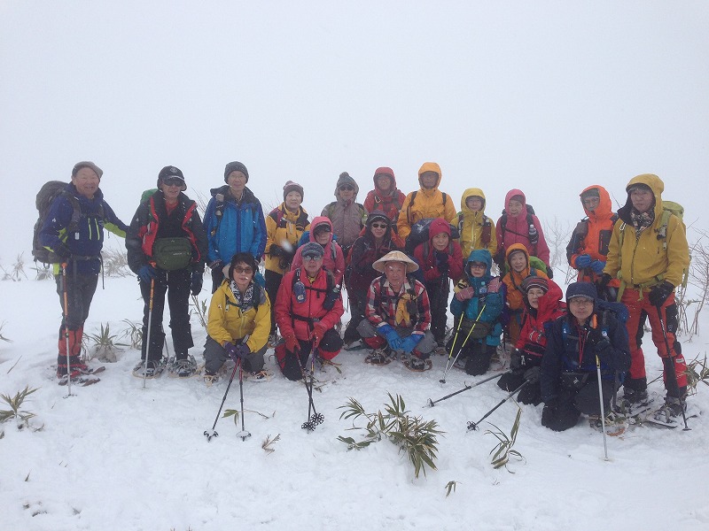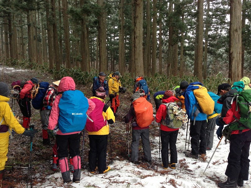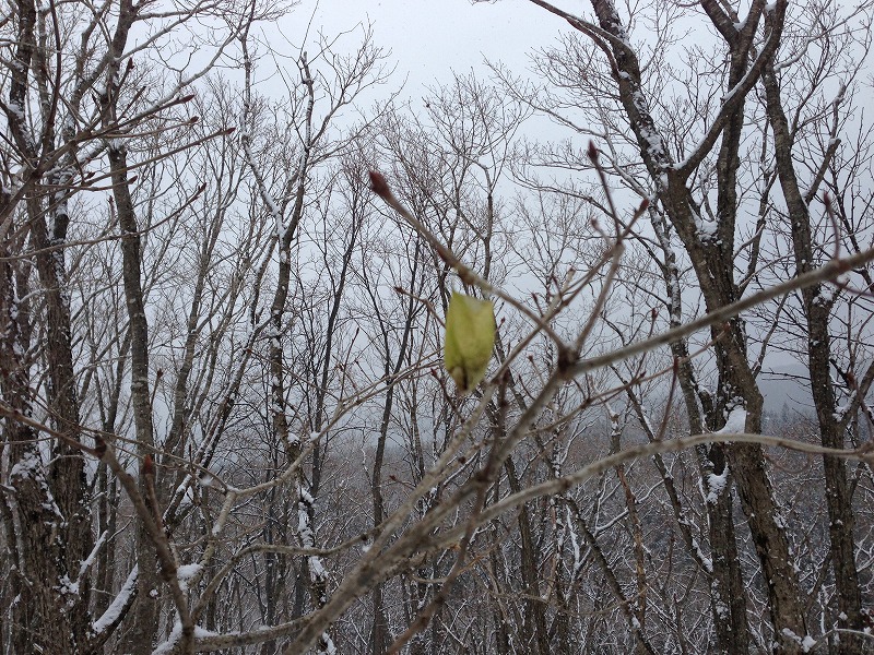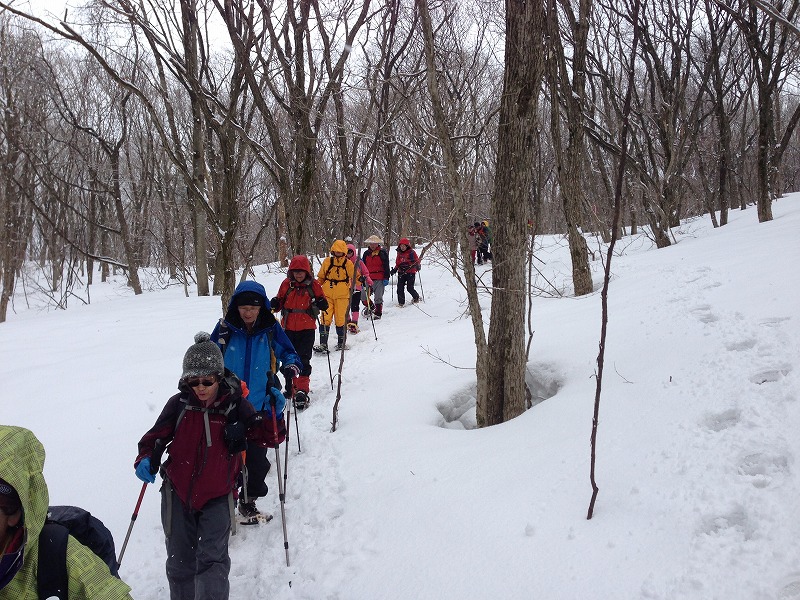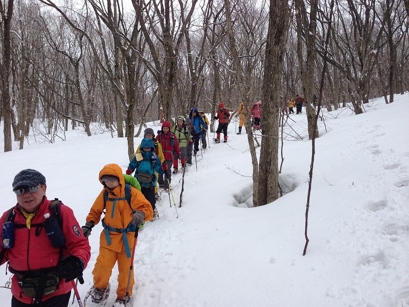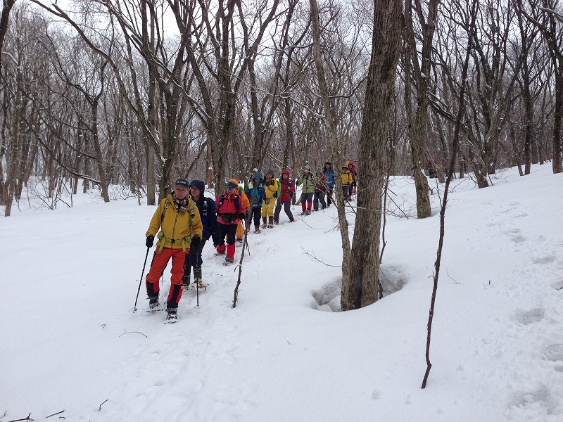 庄内地方に近づくと雨模様になってくる。雨の中でのかんじきは、嫌だなとの思いが湧いて来る。道の駅ふらっとで合流した早坂さんに道案内をして頂き、観音森部落登山口に到着。いつしか、雨も雪に変わる。 会長の挨拶の後、おためしの阿部さんの紹介(再加入)、案内人の早坂さんの話しがある。杉が植林された林道を歩いて往くと直ぐ、雪面を踏み抜く会員が出てきたので、かんじきを装着する。2~3日前に雪が降った様で、真っ白な斜面をひたすら登る。緩やかな斜面が続くが、かんじきを付けているので、灌木を避けるため、右にいったり左に行ったり大変だ。突然、視界が開け観音森が姿を現す。少し下って、登りが 後100m位だろうか?と考えていると直ぐにガスって、山頂が見えなくなってしまう。気を取り直して、山頂を目指す。山頂付近は急斜面で、ズルズル足元が崩れ落ち苦労している会員もいる。そこを過ぎると、山頂だ。しかし、何もなくブッシュがある丸い丘の様である。眺望があれば、日本海そして反対側には鳥海山が見えていたはずで、残念である。辛うじて、足元高さ15cm位の位置に壊れかけた小さな看板があり、「観音」の文字だけが読める。そこで記念写真を撮り、風があり寒いので早々に下山する。風の穏やかな所まで下りて、昼食を取る。しかし、雪が降っている最中なので、食事が済み次第出発する。ここからの下山は、比較的に楽である。途中、黄色の野生の繭や熊棚など珍しい物も見る事が出来、あっという間に登山口まで戻る。 予定よりも早い下山時間なので、秋田県にかほ市と山形県遊佐町にまたがる三崎公園と十六羅漢観音を見学する。三崎公園は、昔から恋人たちの聖地だったと会員の声。十六羅漢観音は、寒くない時に案内板をじっくり見ながら見学してみたい。 最後に、何度も下見をして頂き、案内して下さった早坂さんに感謝致します。 |