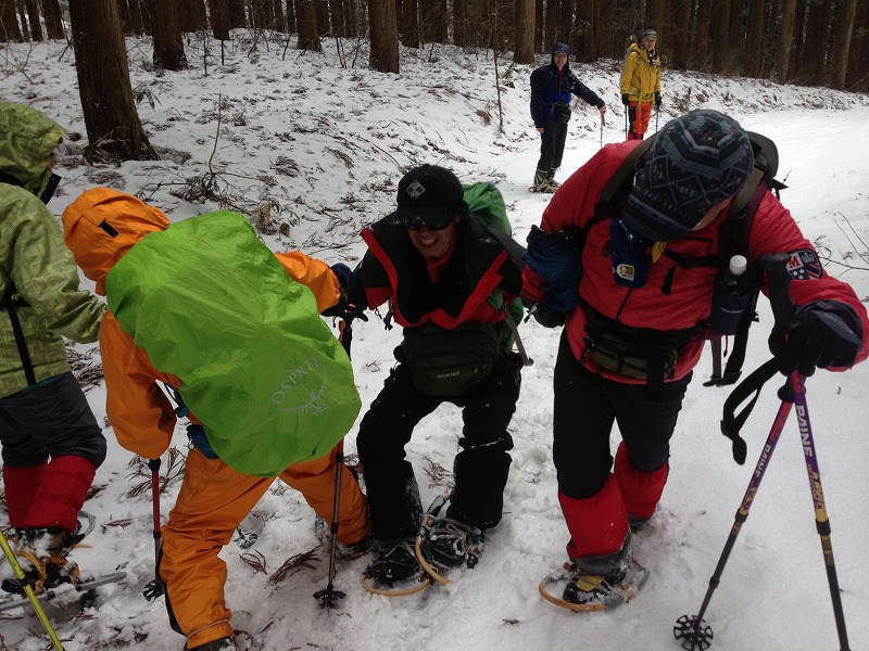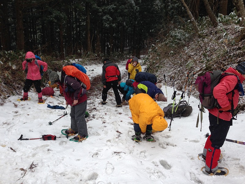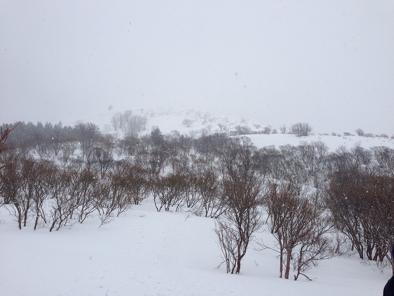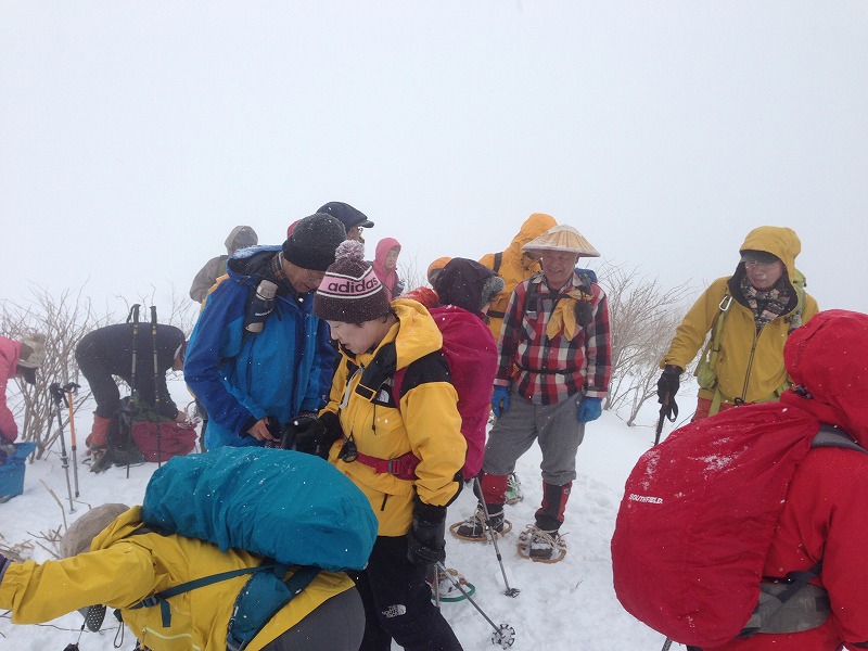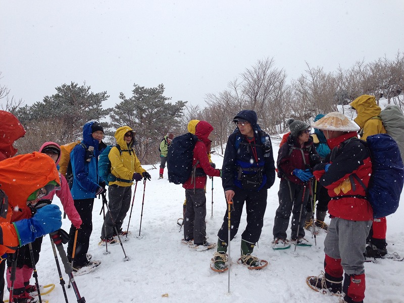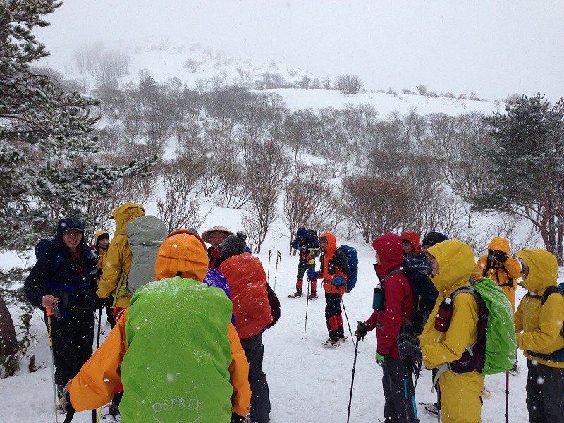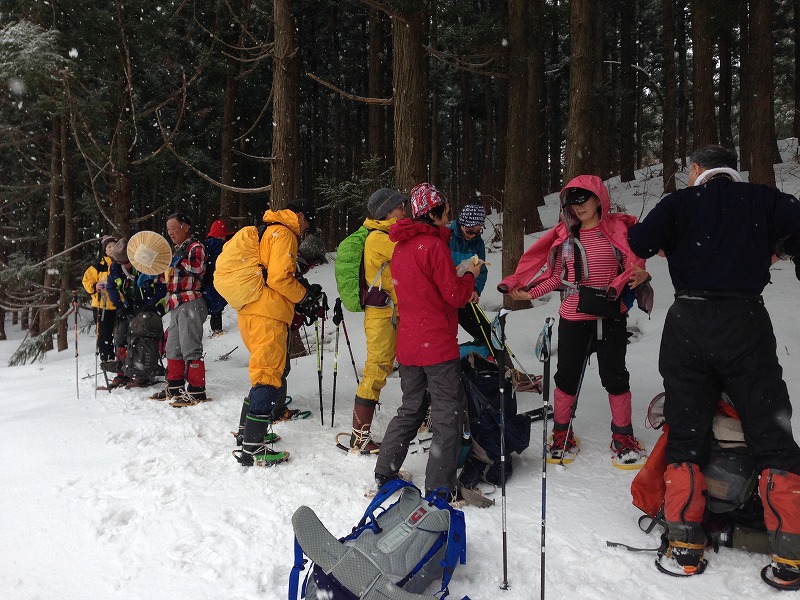 庄内地方に近づくと雨模様になってくる。雨の中でのかんじきは、嫌だなとの思いが湧いて来る。道の駅ふらっとで合流した早坂さんに道案内をして頂き、観音森部落登山口に到着。いつしか、雨も雪に変わる。 会長の挨拶の後、おためしの阿部さんの紹介(再加入)、案内人の早坂さんの話しがある。杉が植林された林道を歩いて往くと直ぐ、雪面を踏み抜く会員が出てきたので、かんじきを装着する。2~3日前に雪が降った様で、真っ白な斜面をひたすら登る。緩やかな斜面が続くが、かんじきを付けているので、灌木を避けるため、右にいったり左に行ったり大変だ。突然、視界が開け観音森が姿を現す。少し下って、登りが 後100m位だろうか?と考えていると直ぐにガスって、山頂が見えなくなってしまう。気を取り直して、山頂を目指す。山頂付近は急斜面で、ズルズル足元が崩れ落ち苦労している会員もいる。そこを過ぎると、山頂だ。しかし、何もなくブッシュがある丸い丘の様である。眺望があれば、日本海そして反対側には鳥海山が見えていたはずで、残念である。辛うじて、足元高さ15cm位の位置に壊れかけた小さな看板があり、「観音」の文字だけが読める。そこで記念写真を撮り、風があり寒いので早々に下山する。風の穏やかな所まで下りて、昼食を取る。しかし、雪が降っている最中なので、食事が済み次第出発する。ここからの下山は、比較的に楽である。途中、黄色の野生の繭や熊棚など珍しい物も見る事が出来、あっという間に登山口まで戻る。 予定よりも早い下山時間なので、秋田県にかほ市と山形県遊佐町にまたがる三崎公園と十六羅漢観音を見学する。三崎公園は、昔から恋人たちの聖地だったと会員の声。十六羅漢観音は、寒くない時に案内板をじっくり見ながら見学してみたい。 最後に、何度も下見をして頂き、案内して下さった早坂さんに感謝致します。 |