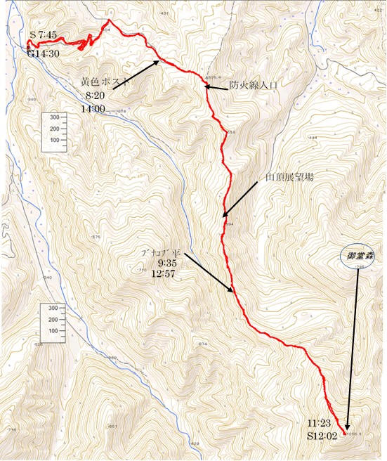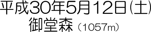 | 5月12日 | 県庁6:11==国道13号==道の駅むらやま6:55==7:29山の神7:45~8:20御堂森登山口8:26~~鳥海山見晴台10:21~~11:14御堂森山頂(昼)12:00~~山頂展望台13:12~~防火線入口13:42~~御堂森登山口13:51~~14:28山の神14:52==道の駅むらやま15:40==県庁16:37 |