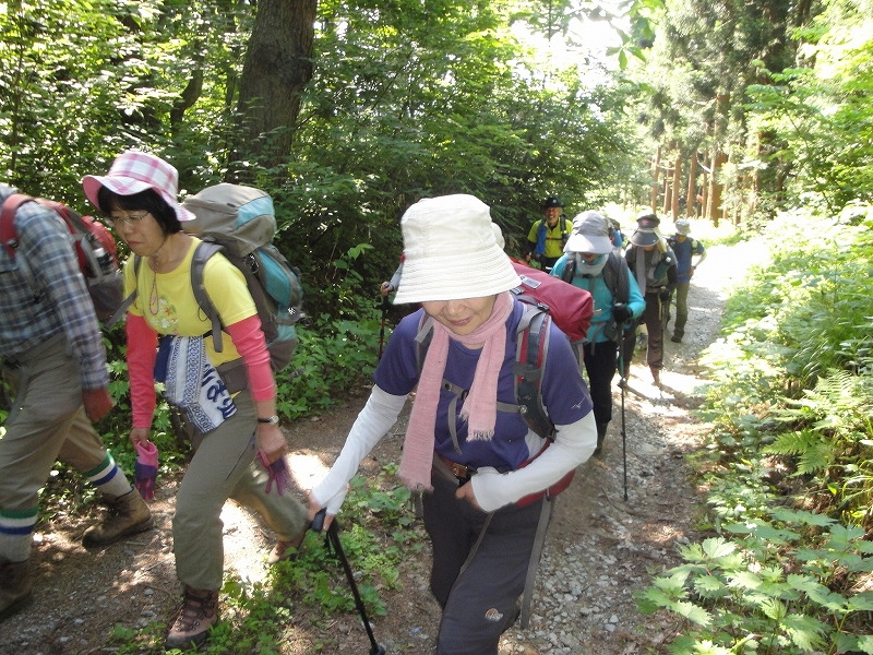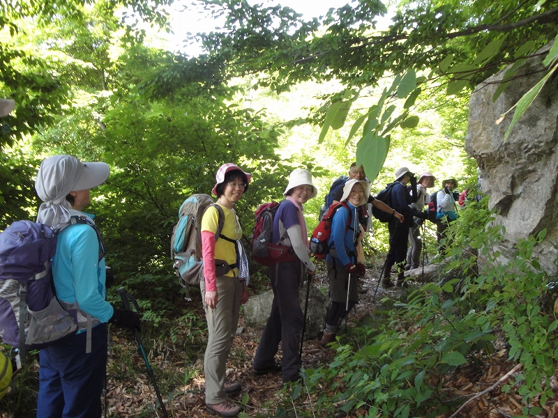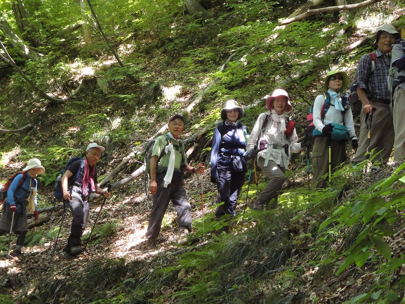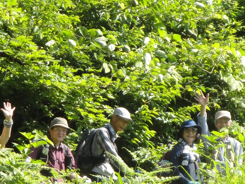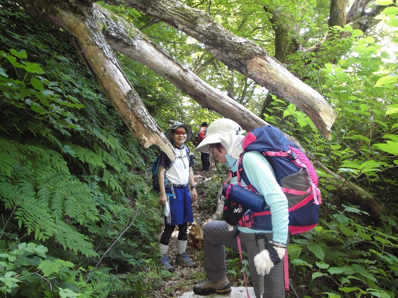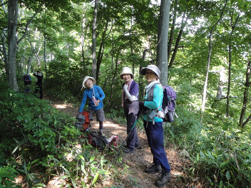 梅雨に入りましたが、今年は雨が少ない様です。今日は朝から良いお天気で気持ちがいいです。草が少しうるさい草岡コースの入口から 飛び石で小川を2か所渡り、朝日軍道の名残のある幅広いブナ林の中を ジグザグと行くと 左手に堀が見える。オケサ堀です。此処からは、コケイランやアカモノが咲く緩やかな道になり 葉山神社に着く、少し下り 360°見晴らしの良い奥の院に着きました。祝瓶山が「ツン」とカッコいい、昼食を済ませ山頂近くの湿原を覗きましたが 雨が少ないせいでしょうか乾いている様でした。帰りは白兎コースを下りギンリョウソウ咲く長い尾根道を下り 葉山神社の鳥居を潜り 葉山森林公園に着きました。 |